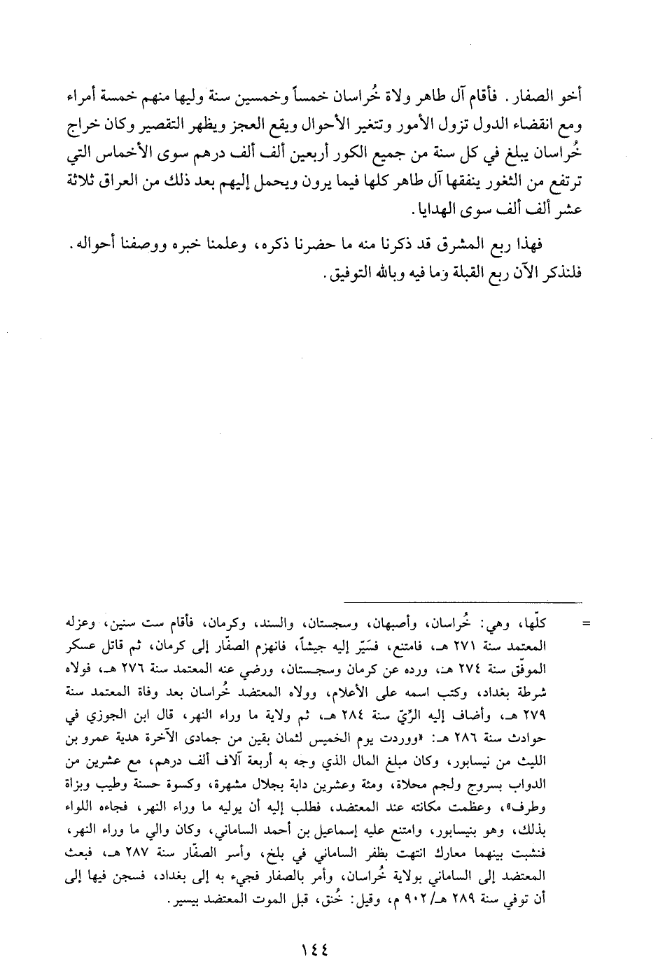 أخو الصفار. فأقام آل طاهر ولاة خراسان خمسا وخمسين سنة وليها منهم خمسة أمراء ومع انقضاء الدول تزول الأمور وتتغير الأحوال ويقع العجز ويظهر التقصير وكان خراج خراسان يبلغ في كل سنة من جميع الكور أربعين ألف ألف درهم سوى الأخماس التي ترتفع من الثغور ينفقها آل طاهر كلها فيما يرون ويحمل إليهم بعد ذلك من العراق ثلاثة عشر ألف ألف سوى الهدايا.