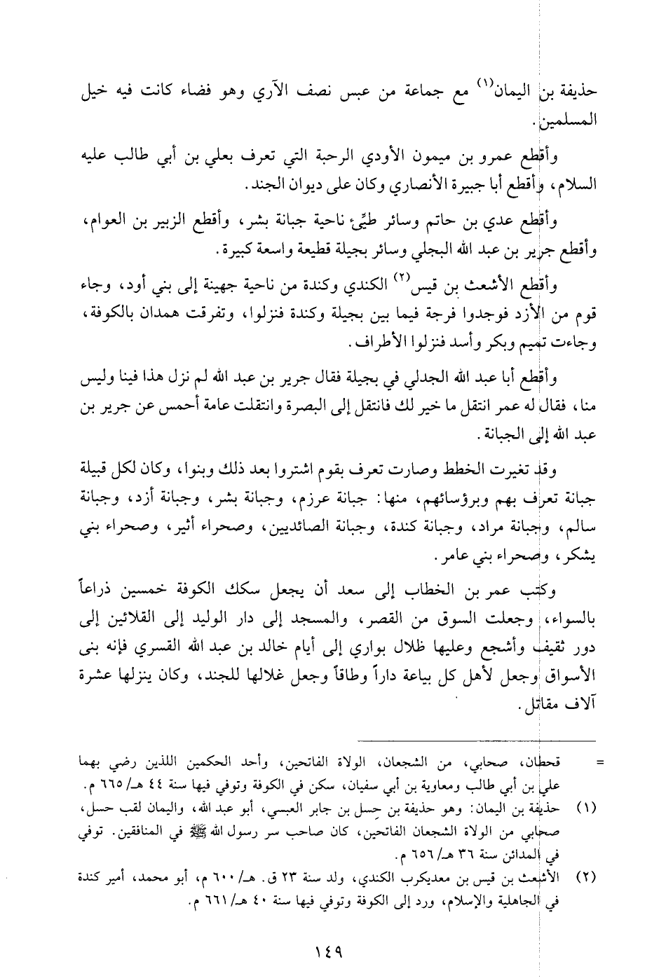 وأقطع عدي بن حاتم وسائر طيّىء ناحية جبانة بشر، وأقطع الزبير بن العوام، وأقطع جرير بن عبد الله البجلي وسائر بجيلة قطيعة واسعة كبيرة.