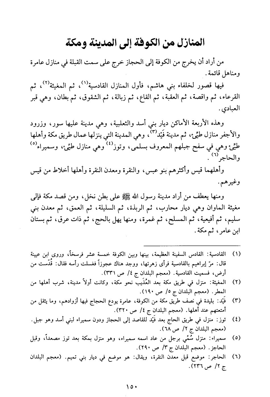 من أراد أن يخرج من الكوفة إلى الحجاز خرج على سمت القبلة في منازل عامرة ومناهل قائمة.