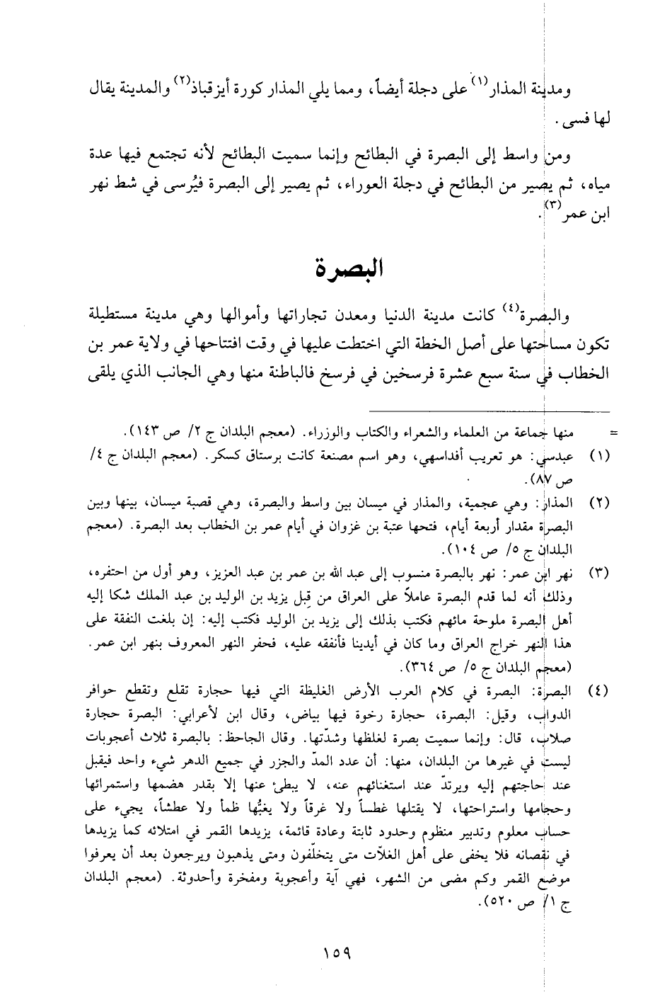 والبصرة «4» كانت مدينة الدنيا ومعدن تجاراتها وأموالها وهي مدينة مستطيلة تكون مساحتها على أصل الخطة التي اختطت عليها في وقت افتتاحها في ولاية عمر بن الخطاب في سنة سبع عشرة فرسخين في فرسخ فالباطنة منها وهي الجانب الذي يلقى