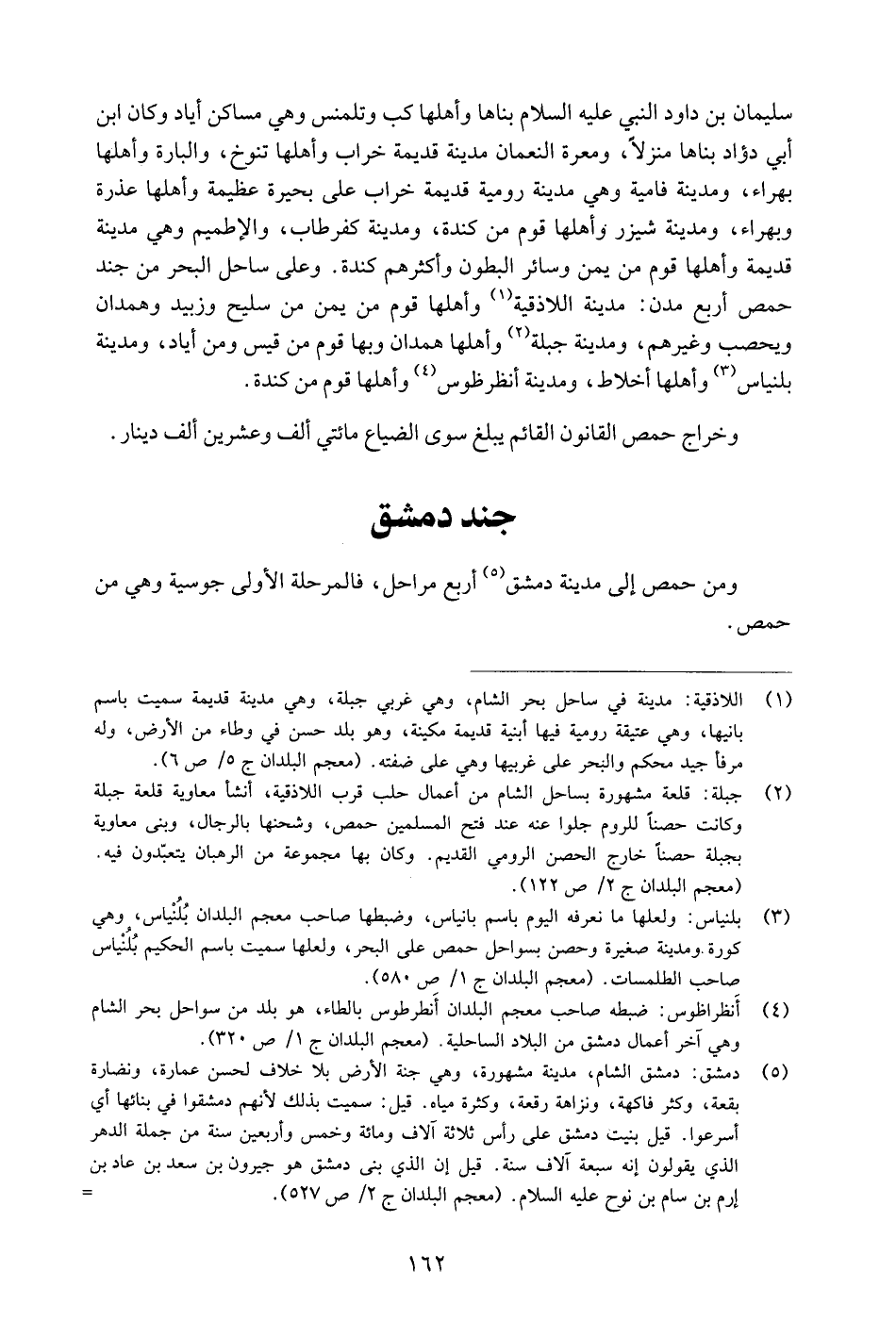 سليمان بن داود النبي عليه السّلام بناها وأهلها كب وتلمنس وهي مساكن أياد وكان ابن أبي دؤاد بناها منزلا، ومعرة النعمان مدينة قديمة خراب وأهلها تنوخ، والبارة وأهلها بهراء، ومدينة فامية وهي مدينة رومية قديمة خراب على بحيرة عظيمة وأهلها عذرة وبهراء، ومدينة شيزر وأهلها قوم من كندة، ومدينة كفر طاب، والإطميم وهي مدينة قديمة وأهلها قوم من يمن وسائر البطون وأكثرهم كندة. وعلى ساحل البحر من جند حمص أربع مدن: مدينة اللاذقية «1» وأهلها قوم من يمن من سليح وزبيد وهمدان ويحصب وغيرهم، ومدينة جبلة «2» وأهلها همدان وبها قوم من قيس ومن أياد، ومدينة بلنياس «3» وأهلها أخلاط، ومدينة أنظرظوس «4» وأهلها قوم من كندة.