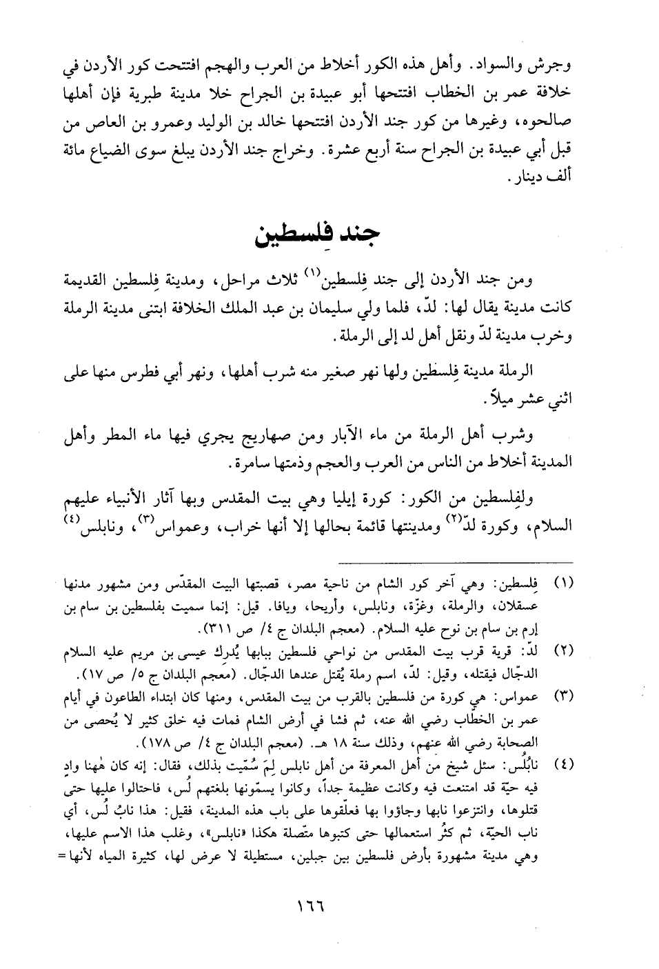 وجرش والسواد. وأهل هذه الكور أخلاط من العرب والهجم افتتحت كور الأردن في خلافة عمر بن الخطاب افتتحها أبو عبيدة بن الجراح خلا مدينة طبرية فإن أهلها صالحوه، وغيرها من كور جند الأردن افتتحها خالد بن الوليد وعمرو بن العاص من قبل أبي عبيدة بن الجراح سنة أربع عشرة. وخراج جند الأردن يبلغ سوى الضياع مائة ألف دينار.