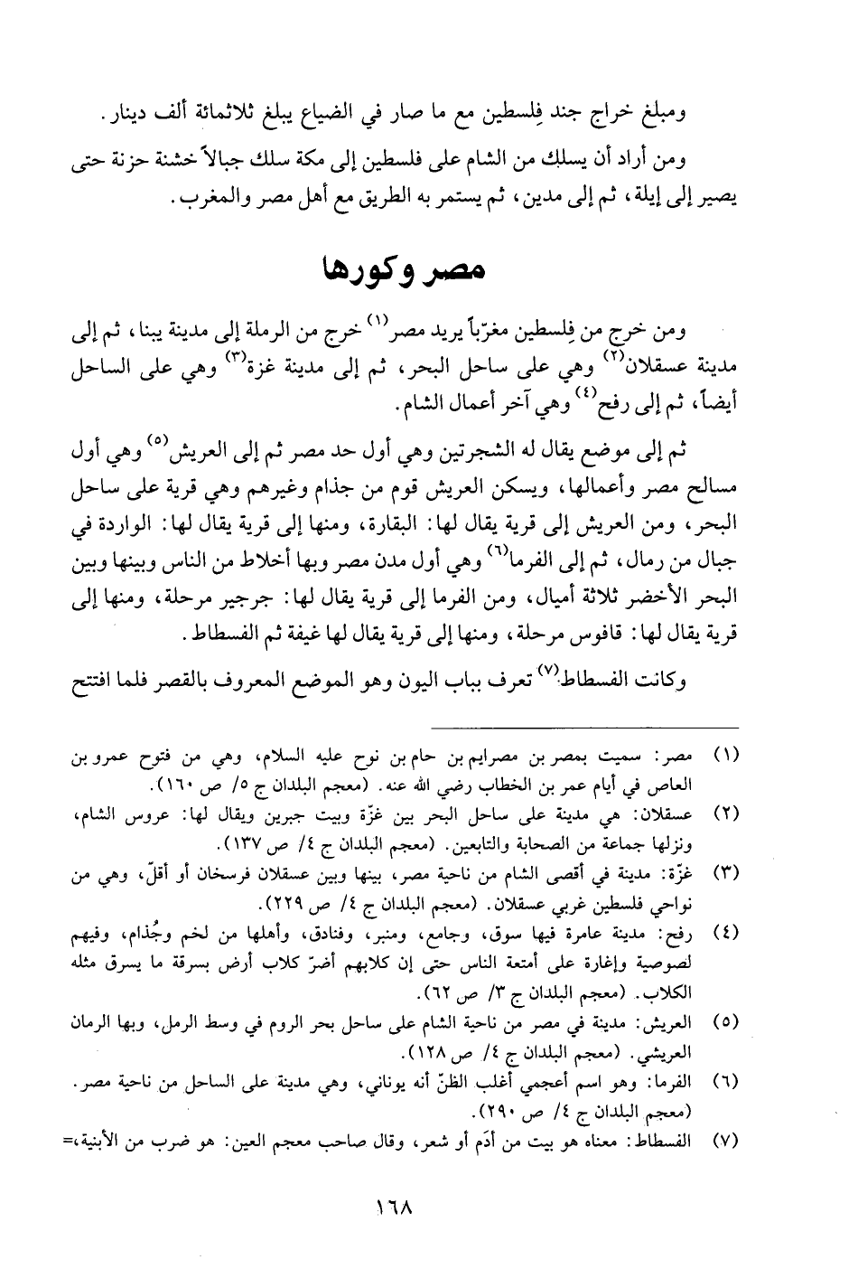 ثم إلى موضع يقال له الشجرتين وهي أول حد مصر ثم إلى العريش «5» وهي أول مسالح مصر وأعمالها، ويسكن العريش قوم من جذام وغيرهم وهي قرية على ساحل البحر، ومن العريش إلى قرية يقال لها: البقارة، ومنها إلى قرية يقال لها: الواردة في جبال من رمال، ثم إلى الفرما «6» وهي أول مدن مصر وبها أخلاط من الناس وبينها وبين البحر الأخضر ثلاثة أميال، ومن الفرما إلى قرية يقال لها: جرجير مرحلة، ومنها إلى قرية يقال لها: قافوس مرحلة، ومنها إلى قرية يقال لها غيفة ثم الفسطاط.