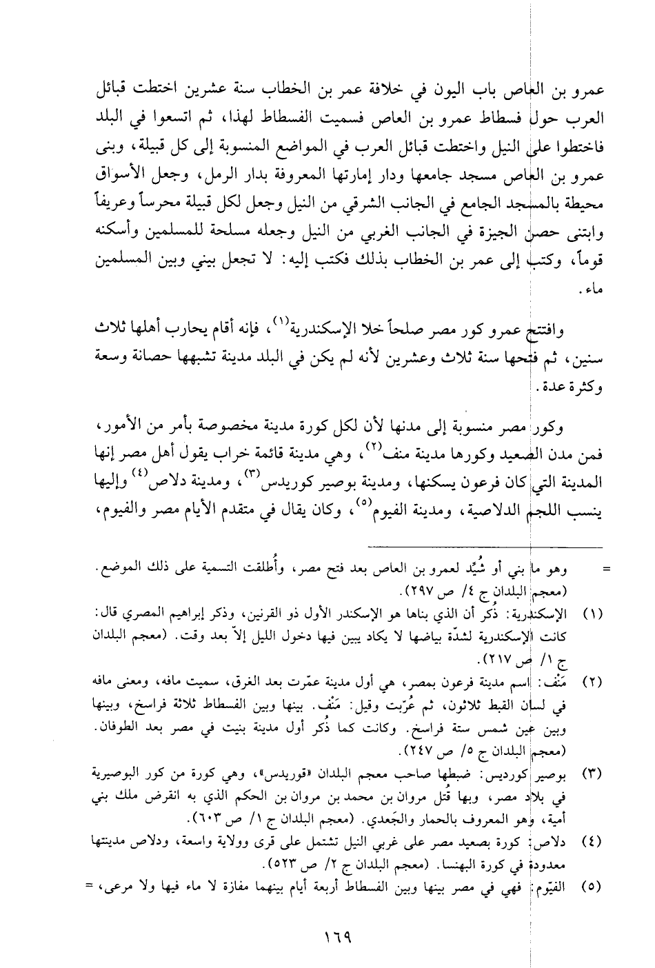وافتتح عمرو كور مصر صلحا خلا الإسكندرية «1» ، فإنه أقام يحارب أهلها ثلاث سنين، ثم فتحها سنة ثلاث وعشرين لأنه لم يكن في البلد مدينة تشبهها حصانة وسعة وكثرة عدة.