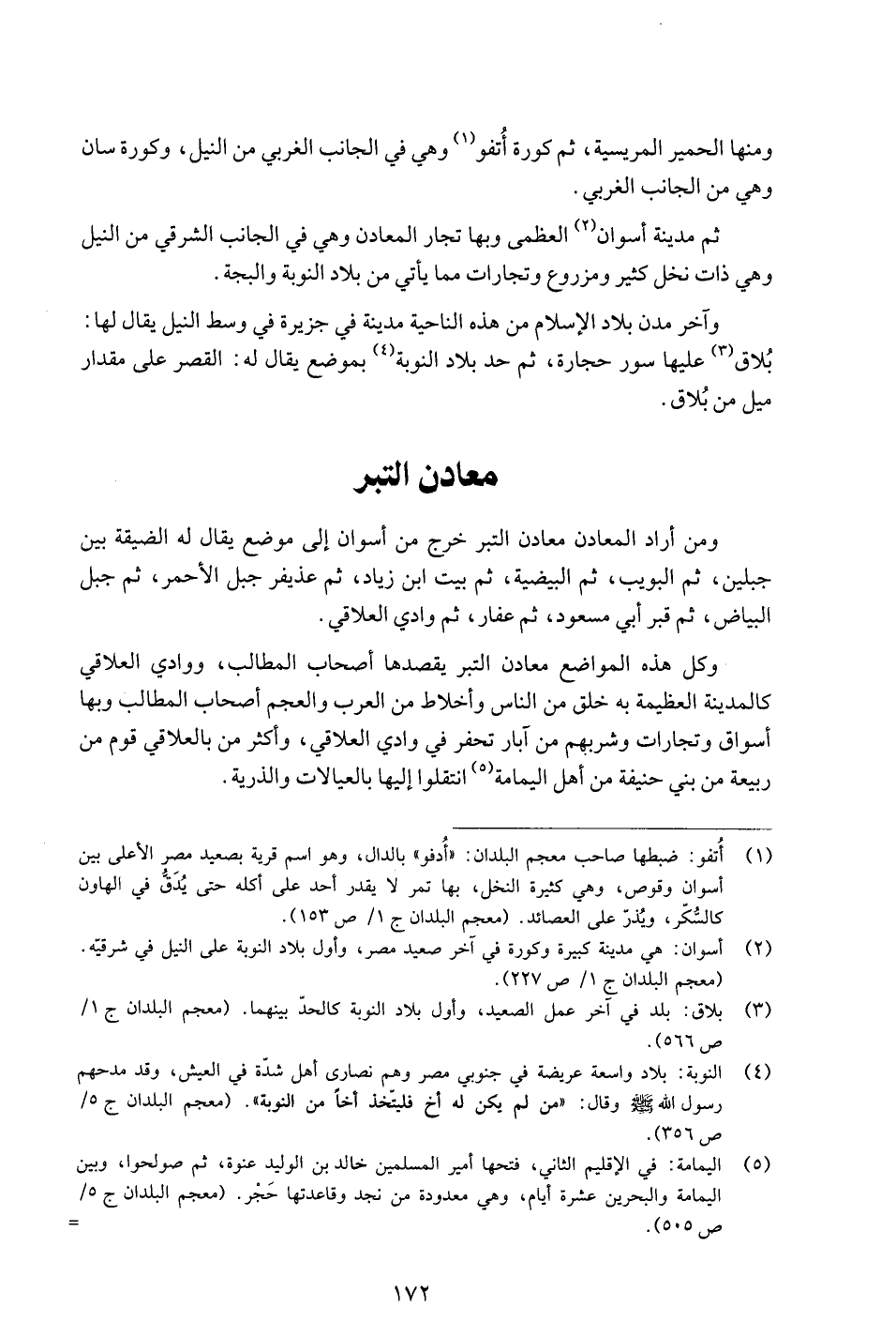ومن أراد المعادن معادن التبر خرج من أسوان إلى موضع يقال له الضيقة بين جبلين، ثم البويب، ثم البيضية، ثم بيت ابن زياد، ثم عذيفر جبل الأحمر، ثم جبل البياض، ثم قبر أبي مسعود، ثم عفار، ثم وادي العلاقي.