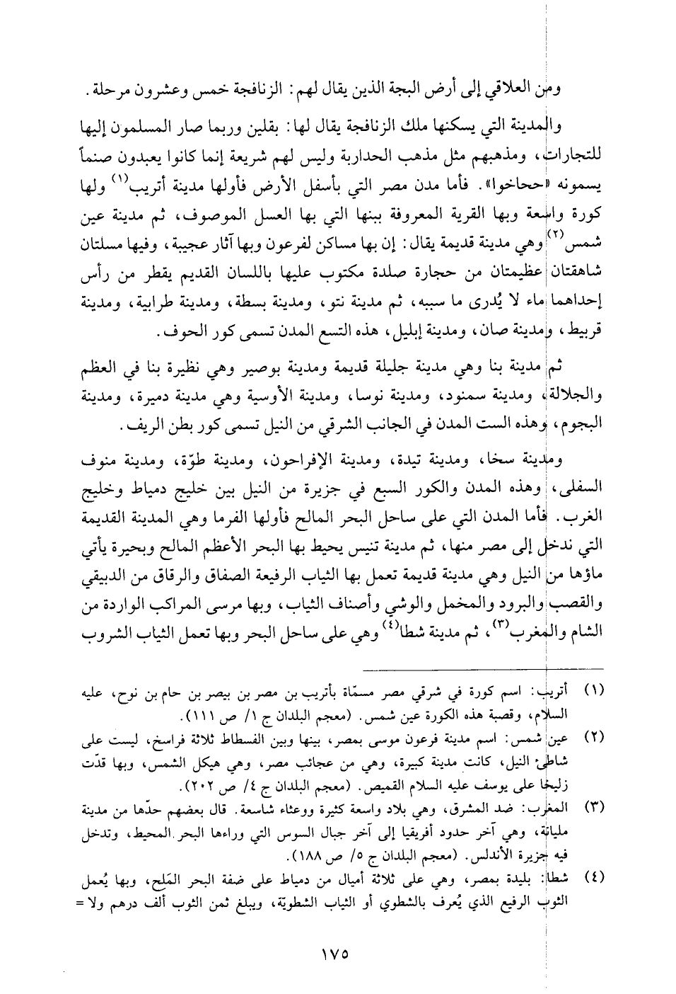 والمدينة التي يسكنها ملك الزنافجة يقال لها: بقلين وربما صار المسلمون إليها للتجارات، ومذهبهم مثل مذهب الحداربة وليس لهم شريعة إنما كانوا يعبدون صنما يسمونه «ححاخوا» . فأما مدن مصر التي بأسفل الأرض فأولها مدينة أتريب «1» ولها كورة واسعة وبها القرية المعروفة بينها التي بها العسل الموصوف، ثم مدينة عين شمس «2» وهي مدينة قديمة يقال: إن بها مساكن لفرعون وبها آثار عجيبة، وفيها مسلتان شاهقتان عظيمتان من حجارة صلدة مكتوب عليها باللسان القديم يقطر من رأس إحداهما ماء لا يدرى ما سببه، ثم مدينة نتو، ومدينة بسطة، ومدينة طرابية، ومدينة قربيط، ومدينة صان، ومدينة إبليل، هذه التسع المدن تسمى كور الحوف.