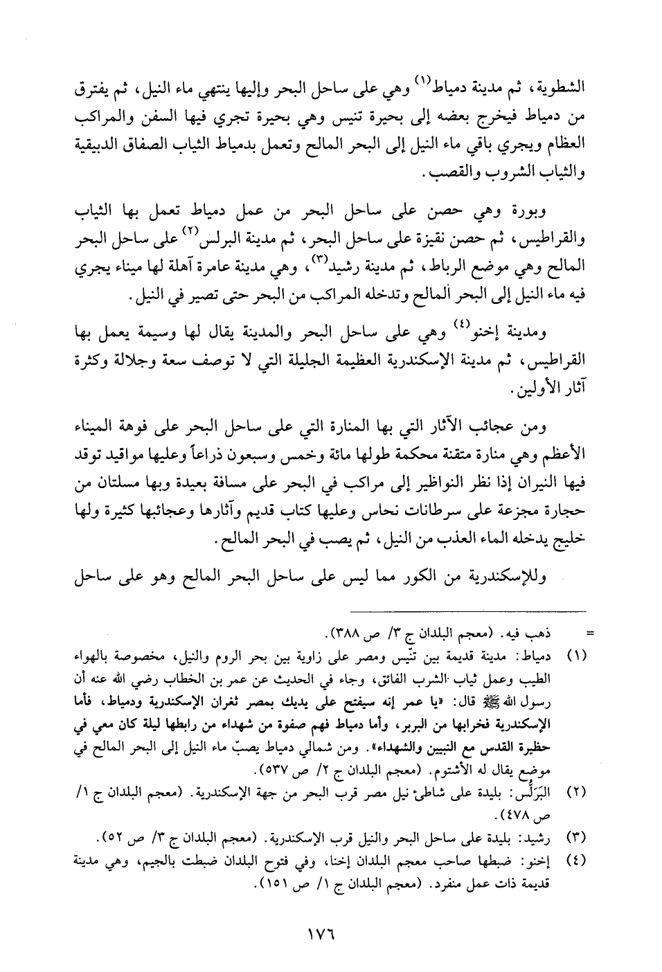 ومدينة إخنو «4» وهي على ساحل البحر والمدينة يقال لها وسيمة يعمل بها القراطيس، ثم مدينة الإسكندرية العظيمة الجليلة التي لا توصف سعة وجلالة وكثرة آثار الأولين.