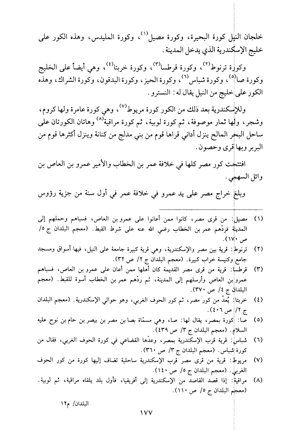 وكورة ترنوط «2» ، وكورة قرطسا «3» ، وكورة خربتا «4» ، وهي أيضا على الخليج وكورة صا «5» ، وكورة شباس «6» ، وكورة الحيز، وكورة البدقون، وكورة الشراك، وهذه الكور على خليج من النيل يقال له: النسترو.