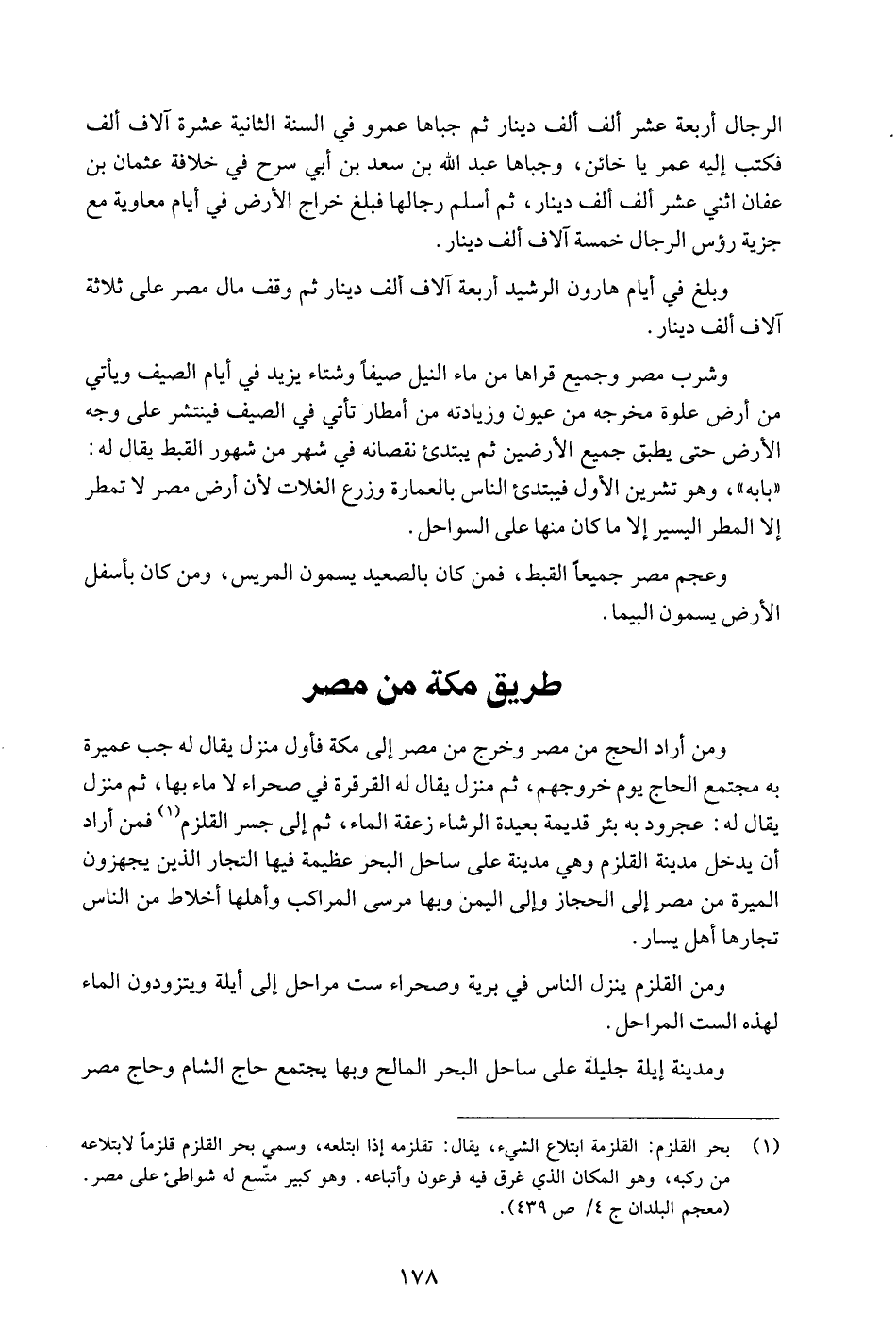 ومن أراد الحج من مصر وخرج من مصر إلى مكة فأول منزل يقال له جب عميرة به مجتمع الحاج يوم خروجهم، ثم منزل يقال له القرقرة في صحراء لا ماء بها، ثم منزل يقال له: عجرود به بئر قديمة بعيدة الرشاء زعقة الماء، ثم إلى جسر القلزم «1» فمن أراد أن يدخل مدينة القلزم وهي مدينة على ساحل البحر عظيمة فيها التجار الذين يجهزون الميرة من مصر إلى الحجاز وإلى اليمن وبها مرسى المراكب وأهلها أخلاط من الناس تجارها أهل يسار.