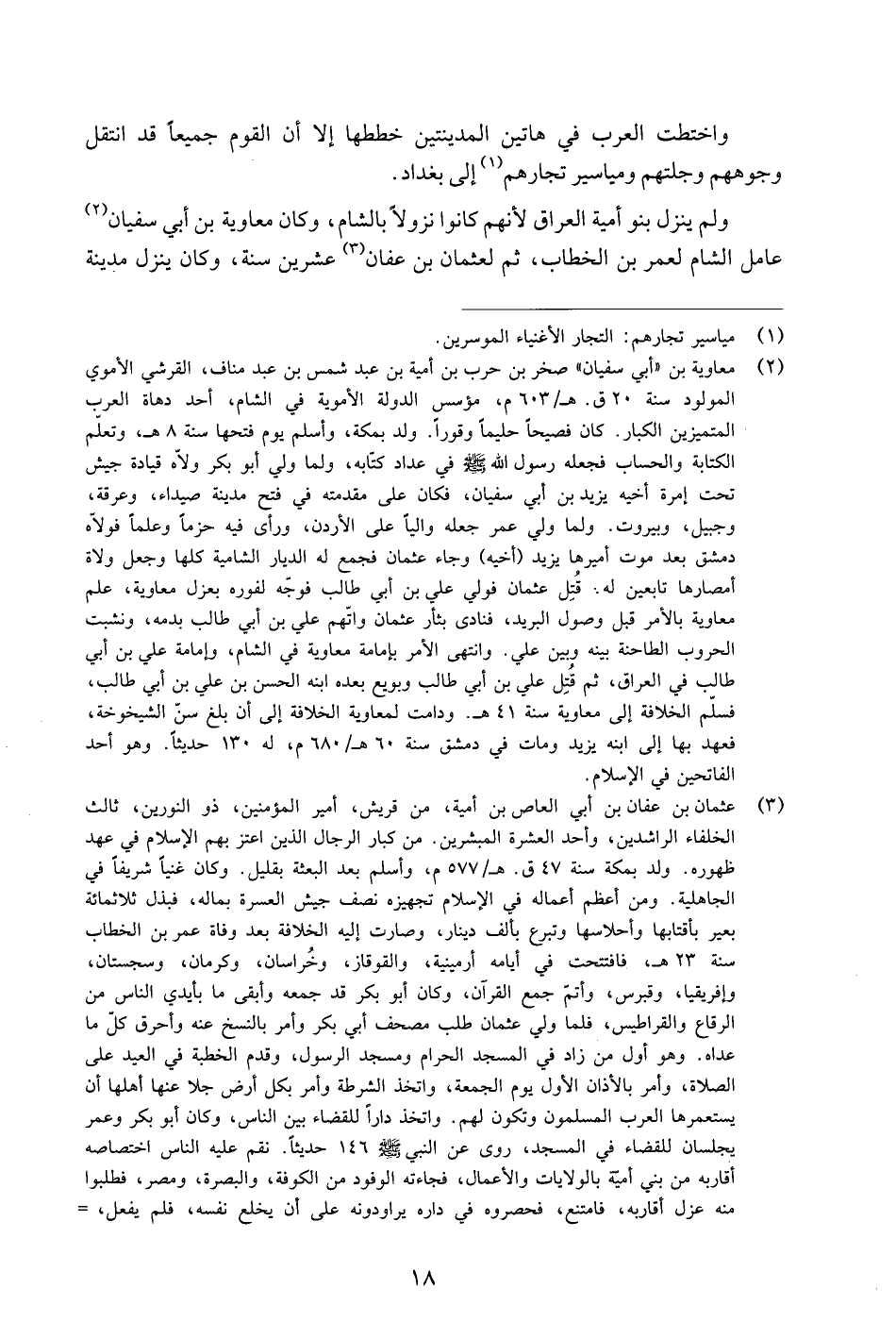 ولم ينزل بنو أمية العراق لأنهم كانوا نزولا بالشام، وكان معاوية بن أبي سفيان «2» عامل الشام لعمر بن الخطاب، ثم لعثمان بن عفان «3» عشرين سنة، وكان ينزل مدينة