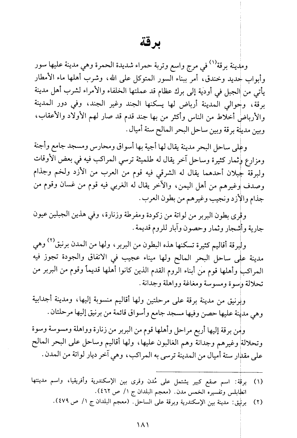 ولبرقة أقاليم كثيرة تسكنها هذه البطون من البربر، ولها من المدن برنيق «2» وهي مدينة على ساحل البحر المالح ولها ميناء عجيب في الاتفاق والجودة تجوز فيه المراكب وأهلها قوم من أبناء الروم القدم الذين كانوا أهلها قديما وقوم من البربر من تحلالة وسوة ومسوسة ومغاغة وواهلة وجدانة.