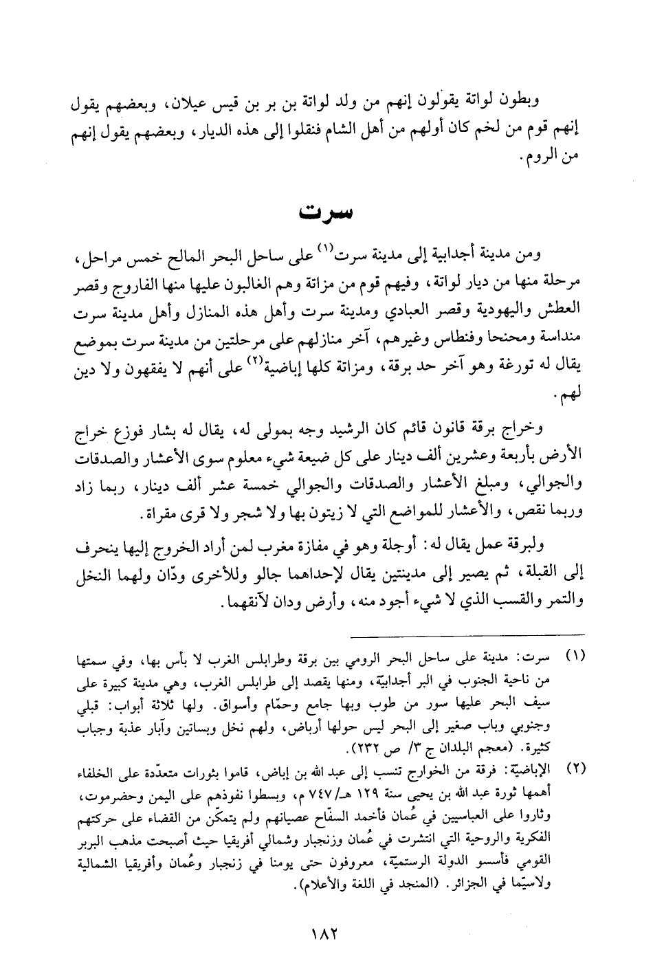 ومن مدينة أجدابية إلى مدينة سرت «1» على ساحل البحر المالح خمس مراحل، مرحلة منها من ديار لواتة، وفيهم قوم من مزاتة وهم الغالبون عليها منها الفاروج وقصر العطش واليهودية وقصر العبادي ومدينة سرت وأهل هذه المنازل وأهل مدينة سرت منداسة ومحنحا وفنطاس وغيرهم، آخر منازلهم على مرحلتين من مدينة سرت بموضع يقال له تورغة وهو آخر حد برقة، ومزاتة كلها إباضية «2» على أنهم لا يفقهون ولا دين لهم.