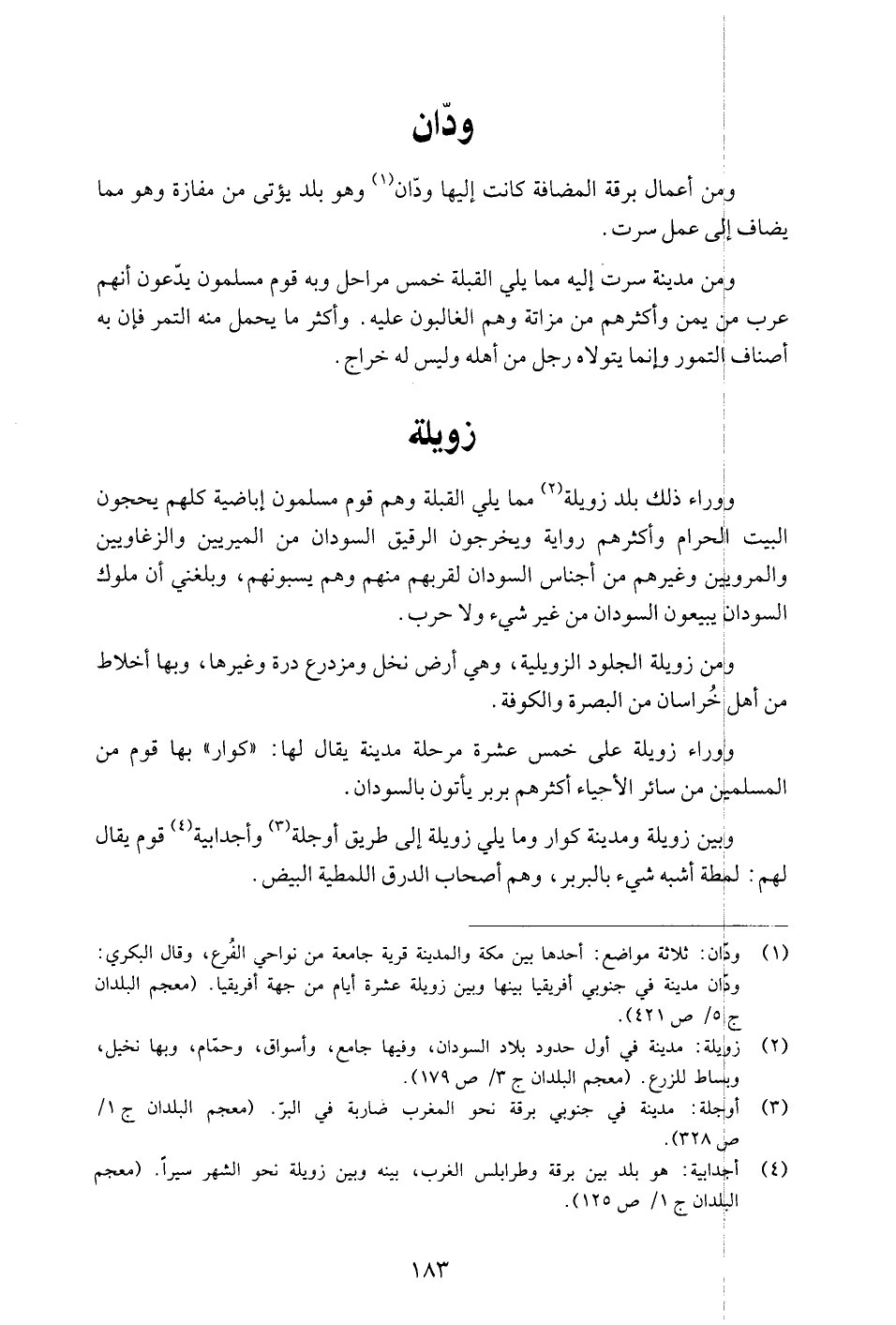 ووراء ذلك بلد زويلة «2» مما يلي القبلة وهم قوم مسلمون إباضية كلهم يحجون البيت الحرام وأكثرهم رواية ويخرجون الرقيق السودان من الميريين والزغاويين والمرويين وغيرهم من أجناس السودان لقربهم منهم وهم يسبونهم، وبلغني أن ملوك السودان يبيعون السودان من غير شيء ولا حرب.