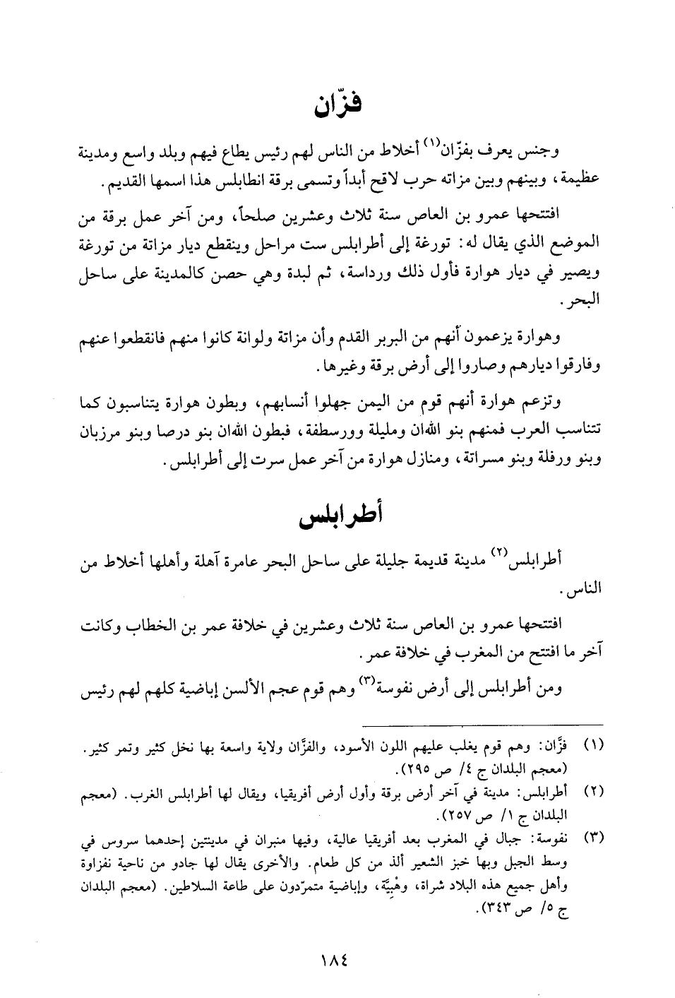 وجنس يعرف بفزّان «1» أخلاط من الناس لهم رئيس يطاع فيهم وبلد واسع ومدينة عظيمة، وبينهم وبين مزاته حرب لاقح أبدا وتسمى برقة أنطابلس هذا اسمها القديم.