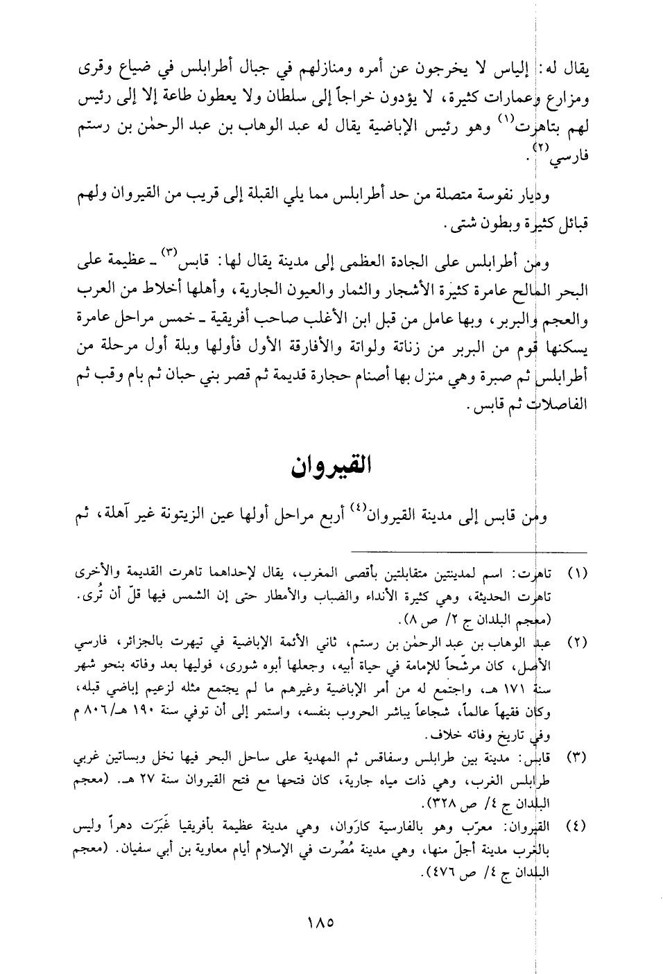 يقال له: إلياس لا يخرجون عن أمره ومنازلهم في جبال أطرابلس في ضياع وقرى ومزارع وعمارات كثيرة، لا يؤدون خراجا إلى سلطان ولا يعطون طاعة إلا إلى رئيس لهم بتاهرت «1» وهو رئيس الإباضية يقال له عبد الوهاب بن عبد الرحمن بن رستم فارسي «2» .