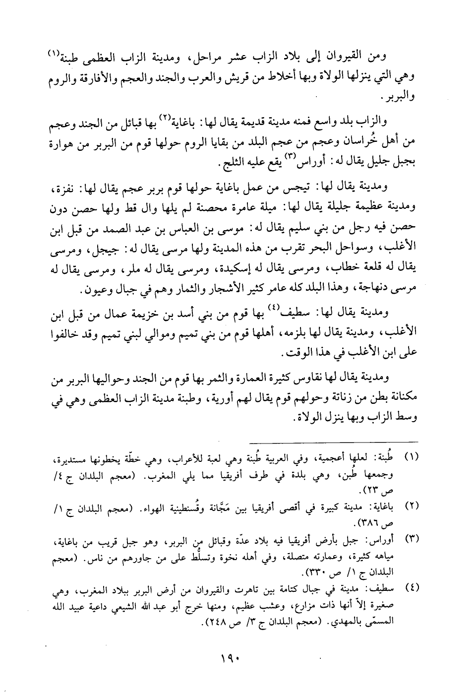 ومدينة يقال لها: سطيف «4» بها قوم من بني أسد بن خزيمة عمال من قبل ابن الأغلب، ومدينة يقال لها بلزمه، أهلها قوم من بني تميم وموالي لبني تميم وقد خالفوا على ابن الأغلب في هذا الوقت.