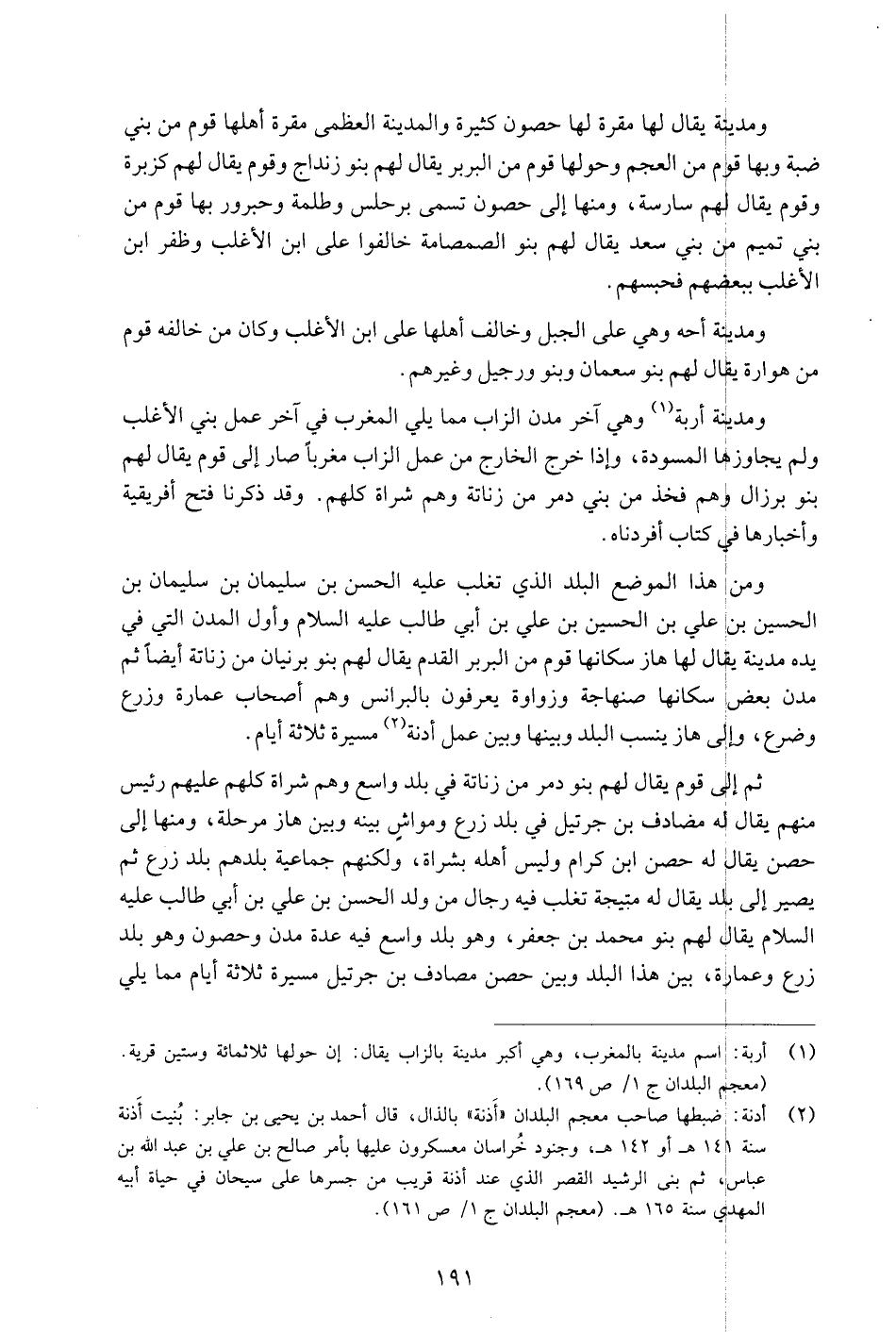ومدينة أربة «1» وهي آخر مدن الزاب مما يلي المغرب في آخر عمل بني الأغلب ولم يجاوزها المسودة، وإذا خرج الخارج من عمل الزاب مغربا صار إلى قوم يقال لهم بنو برزال وهم فخذ من بني دمر من زناتة وهم شراة كلهم. وقد ذكرنا فتح أفريقية وأخبارها في كتاب أفردناه.