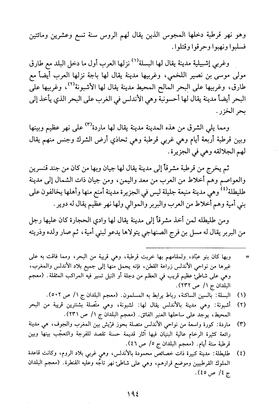 وغربي إشبيلية مدينة يقال لها البسلة «1» نزلها العرب أول ما دخل البلد مع طارق مولى موسى بن نصير اللخمي، وغربيها مدينة يقال لها باجة نزلها العرب أيضا مع طارق، وغربيها على البحر المالح المحيط مدينة يقال لها الأشبونة «2» ، وغربيها على البحر أيضا مدينة يقال لها أحسونبة وهي الأندلس في الغرب على البحر الذي يأخذ إلى بحر الخزر.