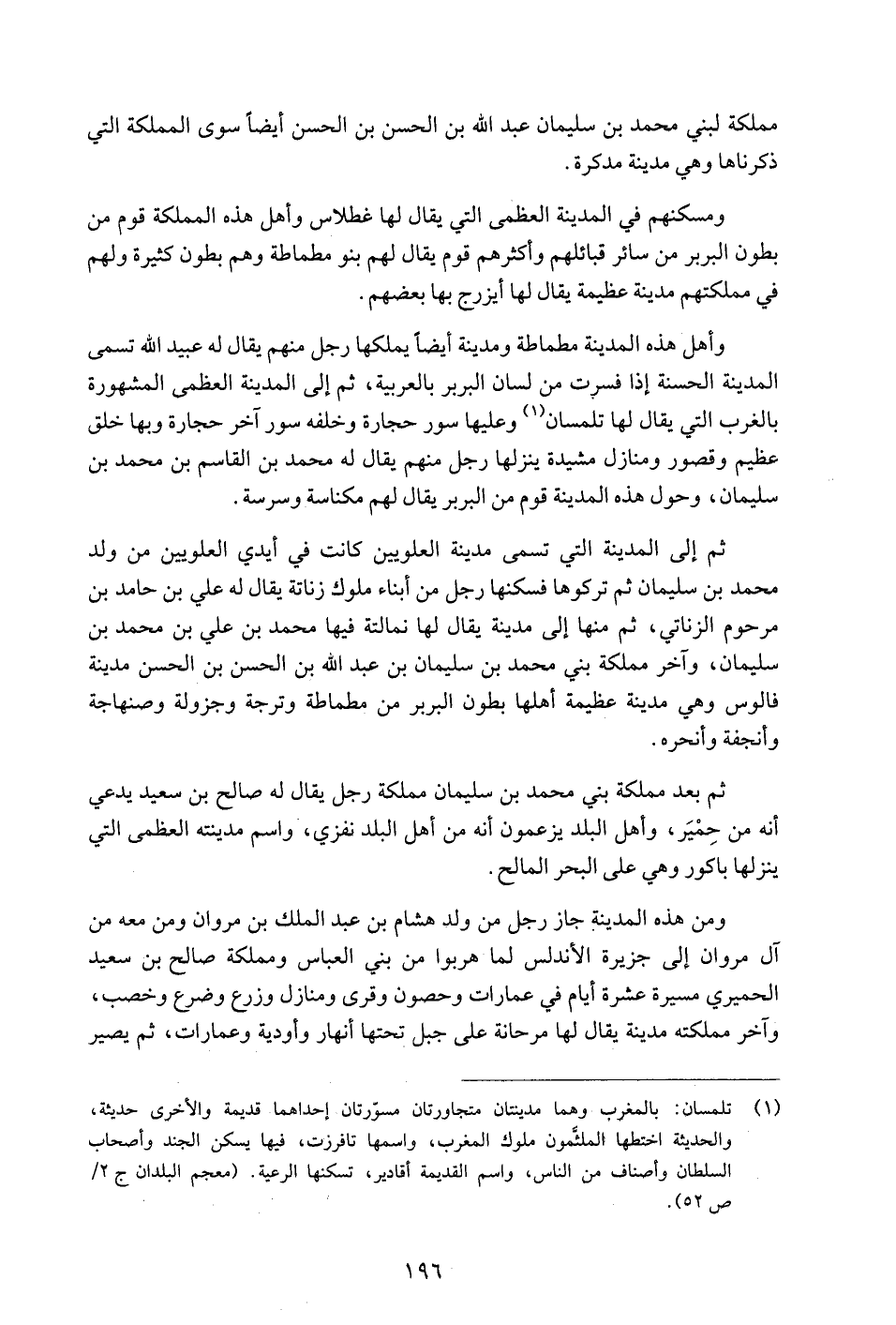 وأهل هذه المدينة مطماطة ومدينة أيضا يملكها رجل منهم يقال له عبيد الله تسمى المدينة الحسنة إذا فسرت من لسان البربر بالعربية، ثم إلى المدينة العظمى المشهورة بالغرب التي يقال لها تلمسان «1» وعليها سور حجارة وخلفه سور آخر حجارة وبها خلق عظيم وقصور ومنازل مشيدة ينزلها رجل منهم يقال له محمد بن القاسم بن محمد بن سليمان، وحول هذه المدينة قوم من البربر يقال لهم مكناسة وسرسة.