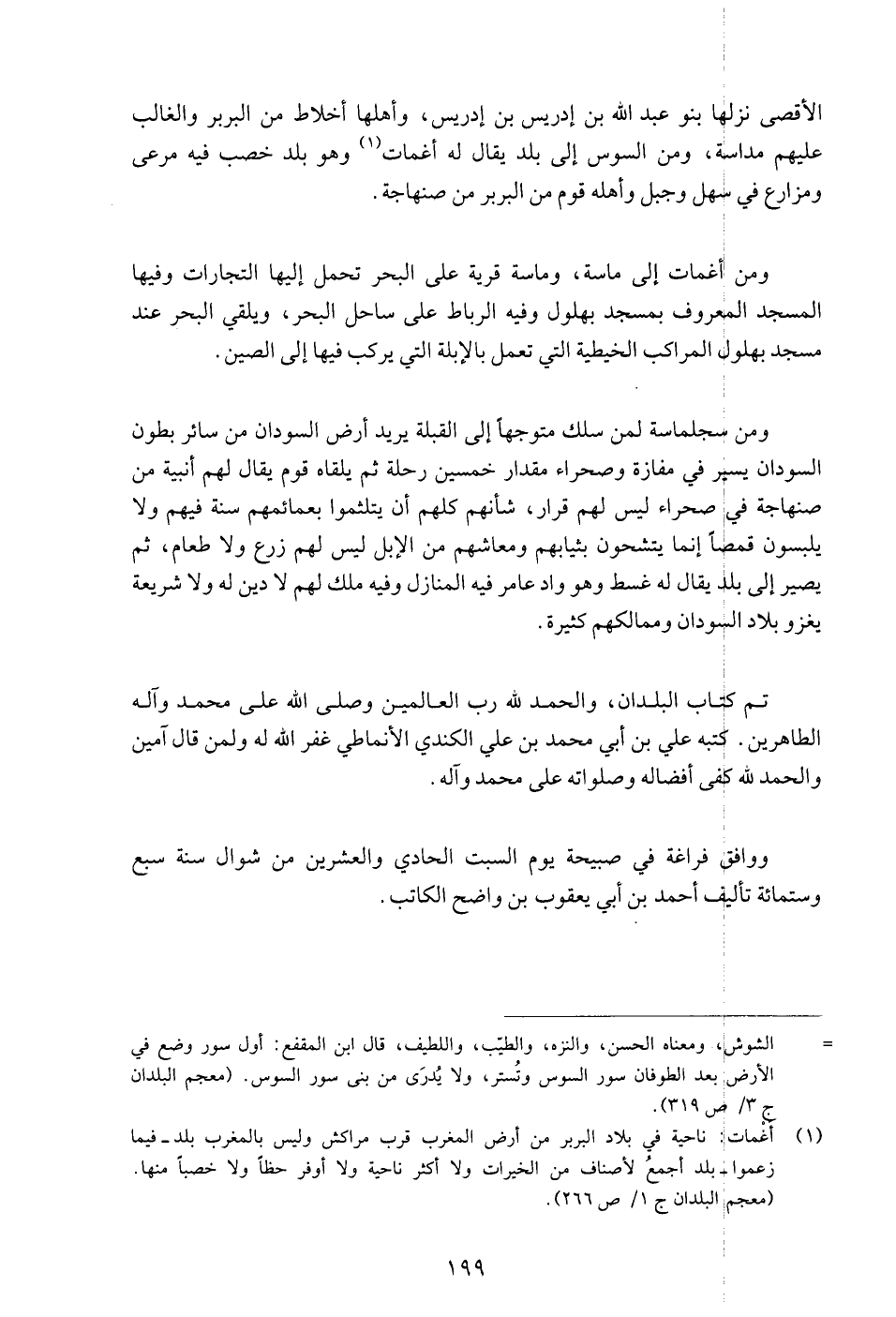 تم كتاب البلدان، والحمد لله رب العالمين وصلى الله على محمد وآله الطاهرين. كتبه علي بن أبي محمد بن علي الكندي الأنماطي غفر الله له ولمن قال آمين والحمد لله كفى أفضاله وصلواته على محمد وآله.