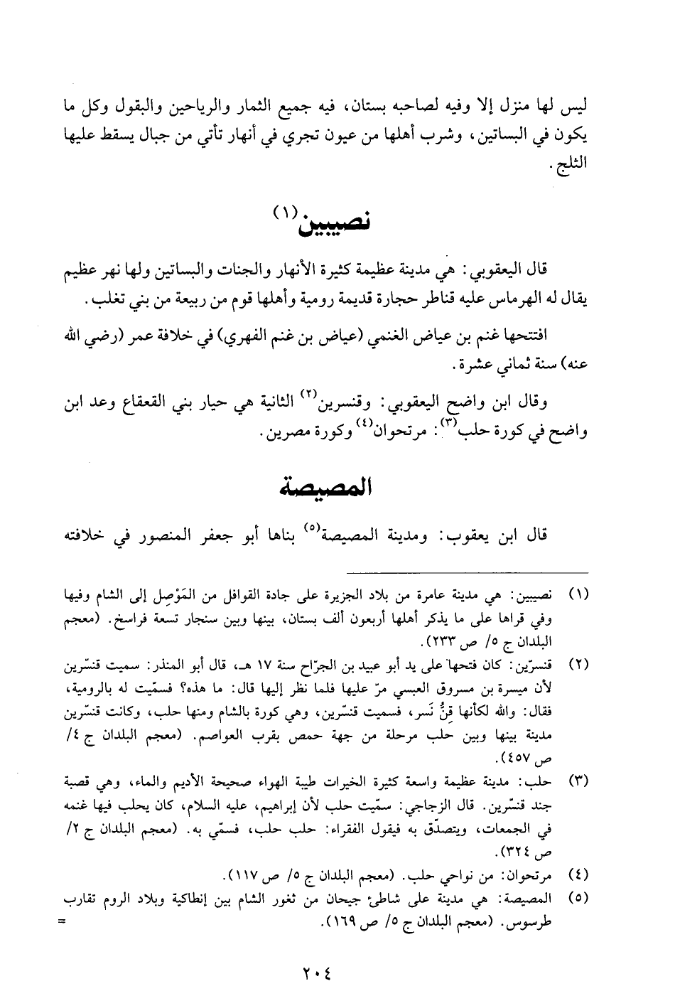 وقال ابن واضح اليعقوبي: وقنسرين «2» الثانية هي حيار بني القعقاع وعد ابن واضح في كورة حلب «3» : مرتحوان «4» وكورة مصرين.