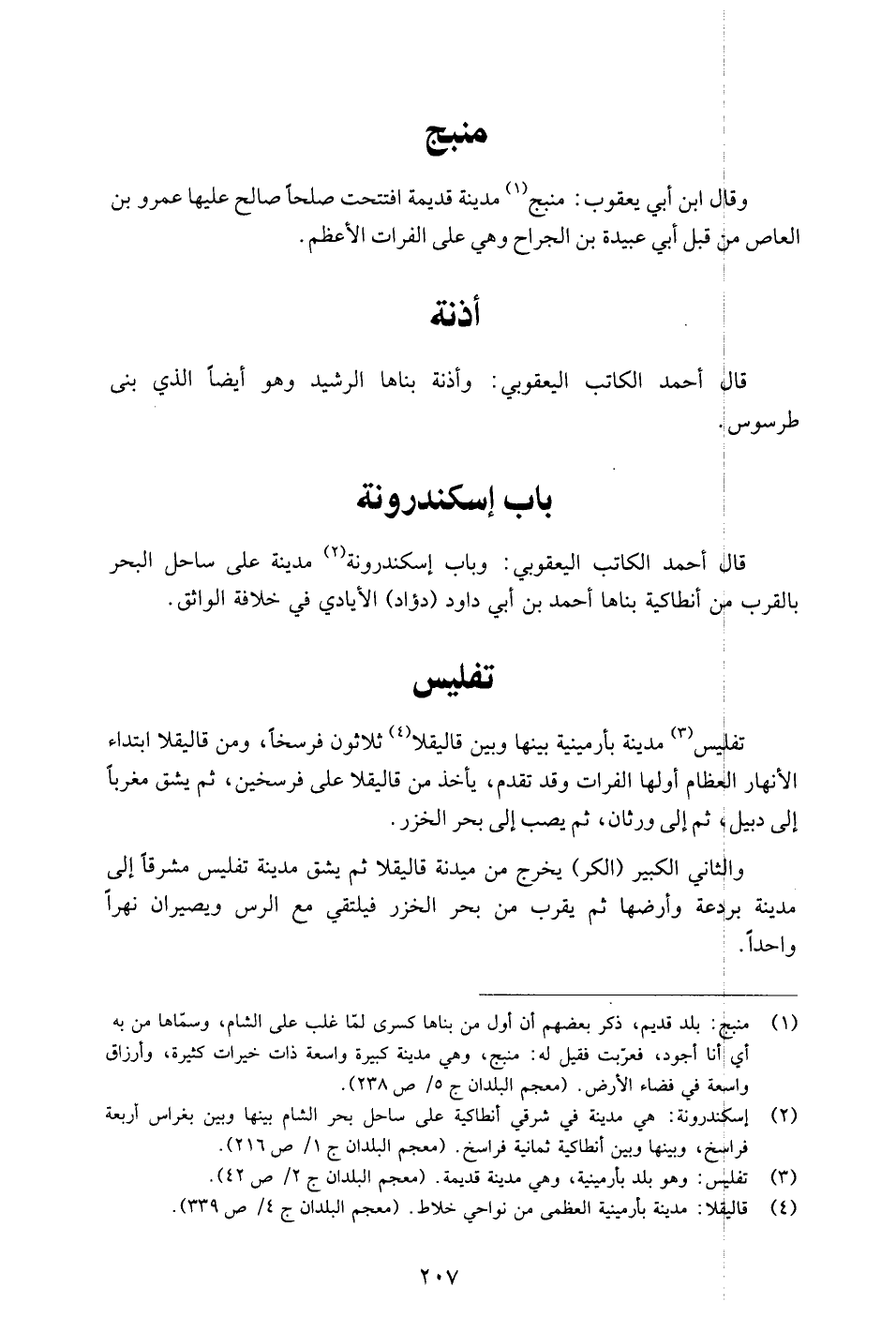 تفليس «3» مدينة بأرمينية بينها وبين قاليقلا «4» ثلاثون فرسخا، ومن قاليقلا ابتداء الأنهار العظام أولها الفرات وقد تقدم، يأخذ من قاليقلا على فرسخين، ثم يشق مغربا إلى دبيل، ثم إلى ورثان، ثم يصب إلى بحر الخزر.