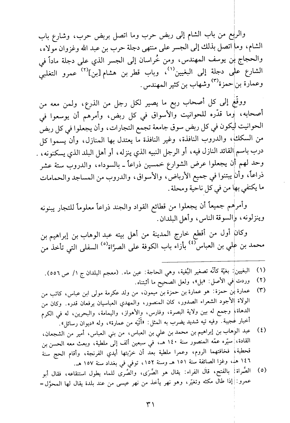 ووقّع إلى كل أصحاب ربع ما يصير لكل رجل من الذرع، ولمن معه من أصحابه، وما قدّره للحوانيت والأسواق في كل ربض، وأمرهم أن يوسعوا في الحوانيت ليكون في كل ربض سوق جامعة تجمع التجارات، وأن يجعلوا في كل ربض من السكك، والدروب النافذة، وغير النافذة ما يعتدل بها المنازل، وأن يسموا كل درب باسم القائد النازل فيه، أو الرجل النبيه الذي ينزله، أو أهل البلد الذي يسكنونه، وحد لهم أن يجعلوا عرض الشوارع خمسين ذراعا- بالسوداء، والدروب ستة عشر ذراعا، وأن يبتنوا في جميع الأرباض، والأسواق، والدروب من المساجد والحمامات ما يكتفي بها من في كل ناحية ومحلة.