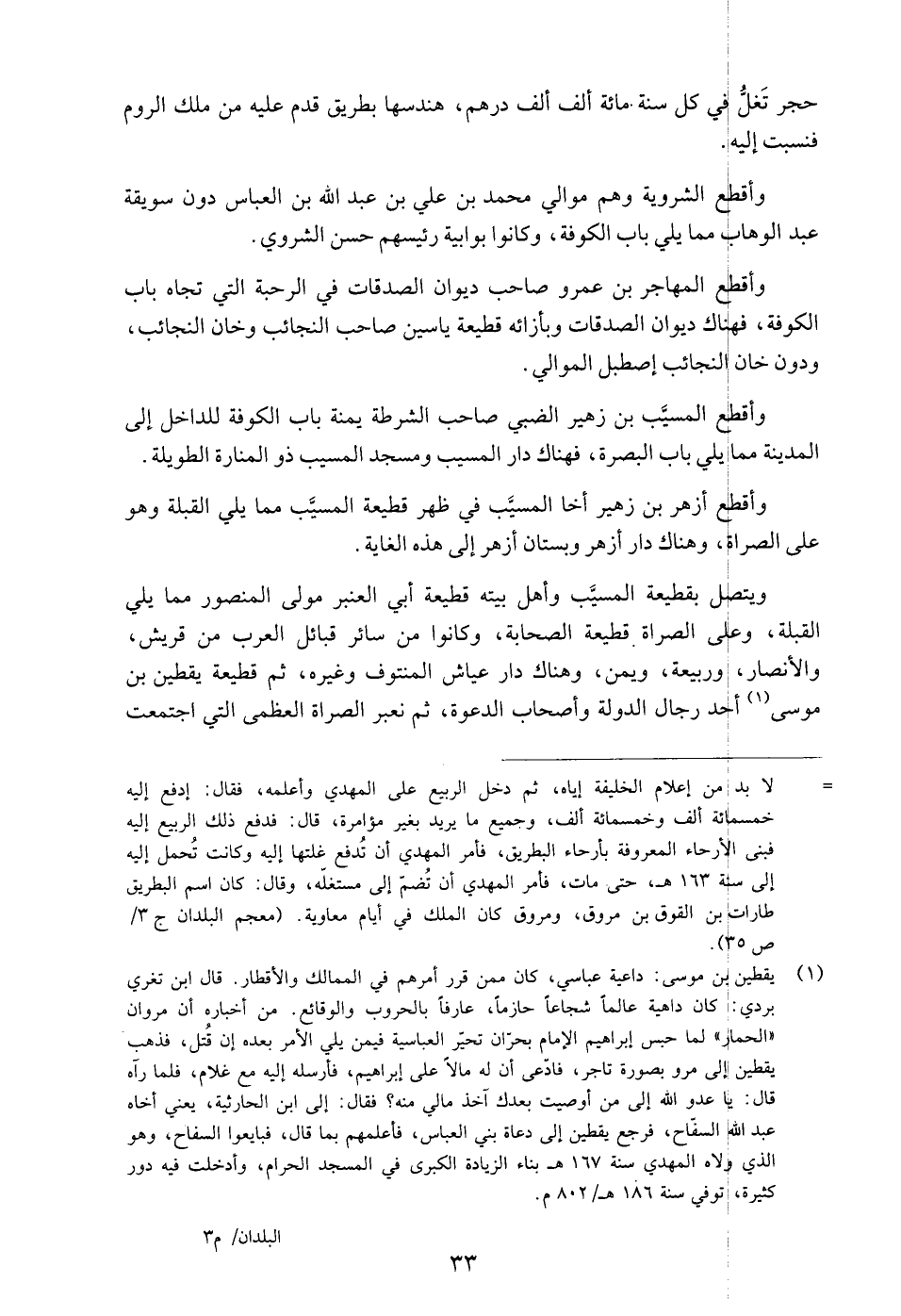 ويتصل بقطيعة المسيّب وأهل بيته قطيعة أبي العنبر مولى المنصور مما يلي القبلة، وعلى الصراة قطيعة الصحابة، وكانوا من سائر قبائل العرب من قريش، والأنصار، وربيعة، ويمن، وهناك دار عياش المنتوف وغيره، ثم قطيعة يقطين بن موسى «1» أحد رجال الدولة وأصحاب الدعوة، ثم نعبر الصراة العظمى التي اجتمعت