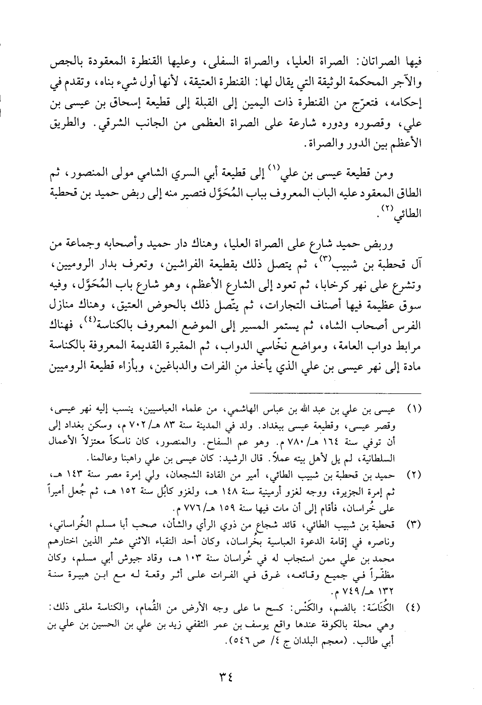 وربض حميد شارع على الصراة العليا، وهناك دار حميد وأصحابه وجماعة من آل قحطبة بن شبيب «3» ، ثم يتصل ذلك بقطيعة الفراشين، وتعرف بدار الروميين، وتشرع على نهر كرخابا، ثم تعود إلى الشارع الأعظم، وهو شارع باب المحوّل، وفيه سوق عظيمة فيها أصناف التجارات، ثم يتّصل ذلك بالحوض العتيق، وهناك منازل الفرس أصحاب الشاه، ثم يستمر المسير إلى الموضع المعروف بالكناسة «4» ، فهناك مرابط دواب العامة، ومواضع نخّاسي الدواب، ثم المقبرة القديمة المعروفة بالكناسة مادة إلى نهر عيسى بن علي الذي يأخذ من الفرات والدباغين، وبإزاء قطيعة الروميين