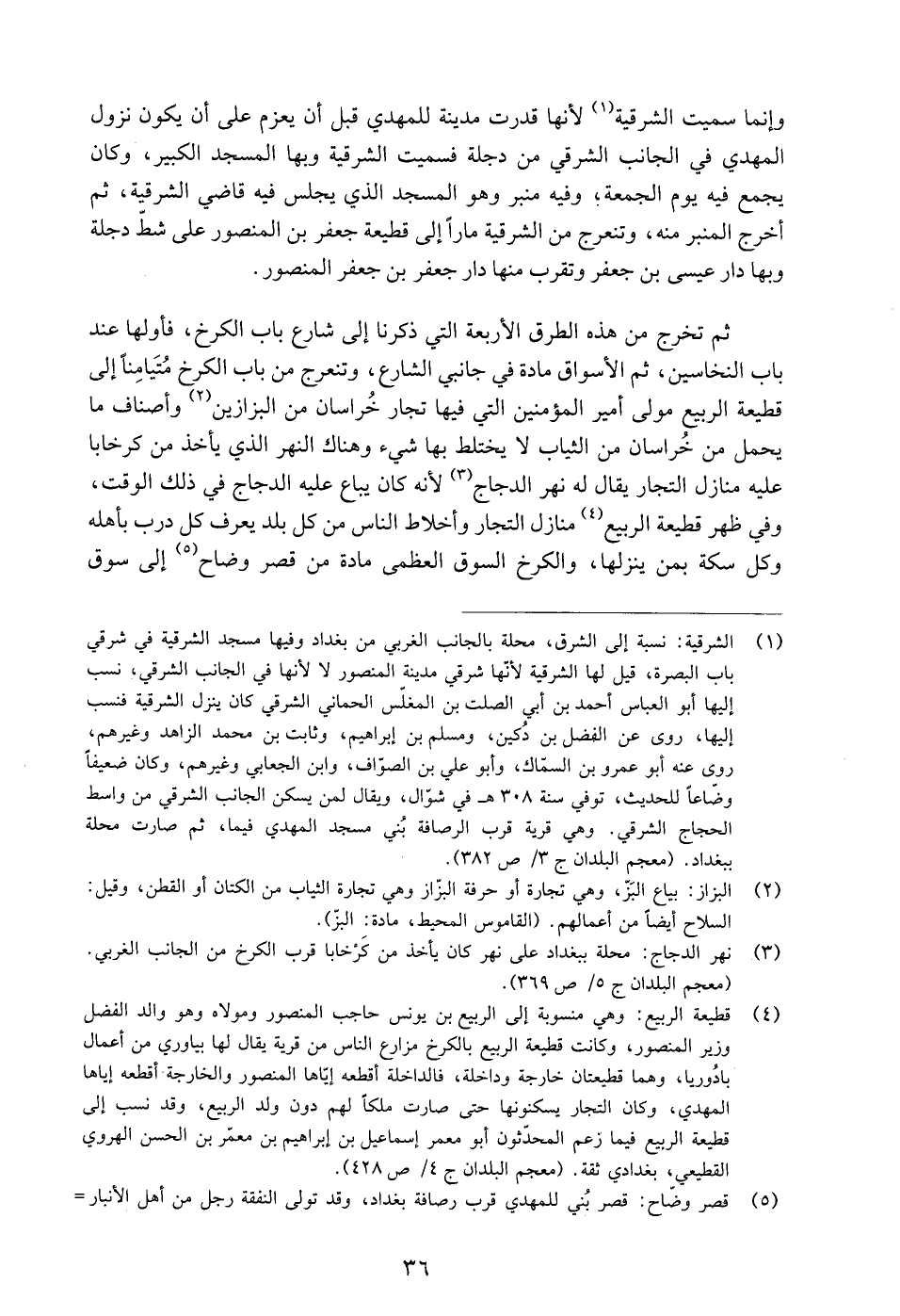 وإنما سميت الشرقية «1» لأنها قدرت مدينة للمهدي قبل أن يعزم على أن يكون نزول المهدي في الجانب الشرقي من دجلة فسميت الشرقية وبها المسجد الكبير، وكان يجمع فيه يوم الجمعة، وفيه منبر وهو المسجد الذي يجلس فيه قاضي الشرقية، ثم أخرج المنبر منه، وتنعرج من الشرقية مارا إلى قطيعة جعفر بن المنصور على شطّ دجلة وبها دار عيسى بن جعفر وتقرب منها دار جعفر بن جعفر المنصور.