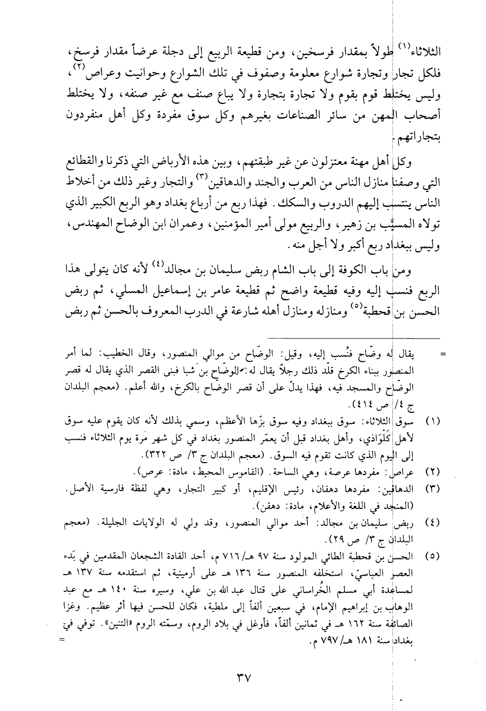 وكل أهل مهنة معتزلون عن غير طبقتهم، وبين هذه الأرباض التي ذكرنا والقطائع التي وصفنا منازل الناس من العرب والجند والدهاقين «3» والتجار وغير ذلك من أخلاط الناس ينتسب إليهم الدروب والسكك. فهذا ربع من أرباع بغداد وهو الربع الكبير الذي تولاه المسيّب بن زهير، والربيع مولى أمير المؤمنين، وعمران ابن الوضاح المهندس، وليس ببغداد ربع أكبر ولا أجل منه.