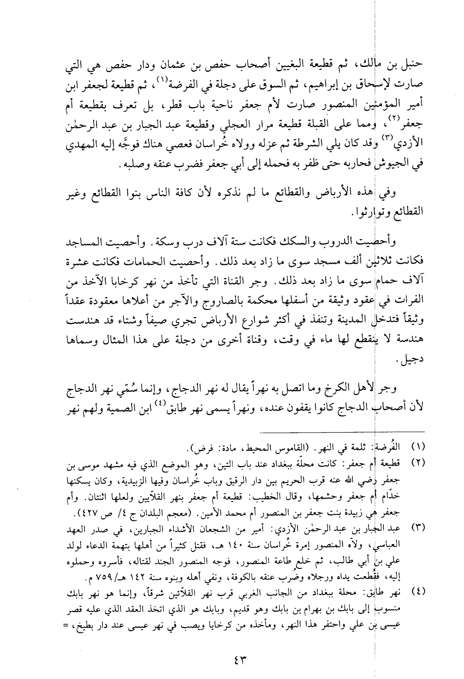 وأحصيت الدروب والسكك فكانت ستة آلاف درب وسكة. وأحصيت المساجد فكانت ثلاثين ألف مسجد سوى ما زاد بعد ذلك. وأحصيت الحمامات فكانت عشرة آلاف حمام سوى ما زاد بعد ذلك. وجر القناة التي تأخذ من نهر كرخابا الآخذ من الفرات في عقود وثيقة من أسفلها محكمة بالصاروج والآجر من أعلاها معقودة عقدا وثيقا فتدخل المدينة وتنفذ في أكثر شوارع الأرباض تجري صيفا وشتاء قد هندست هندسة لا ينقطع لها ماء في وقت، وقناة أخرى من دجلة على هذا المثال وسماها دجيل.