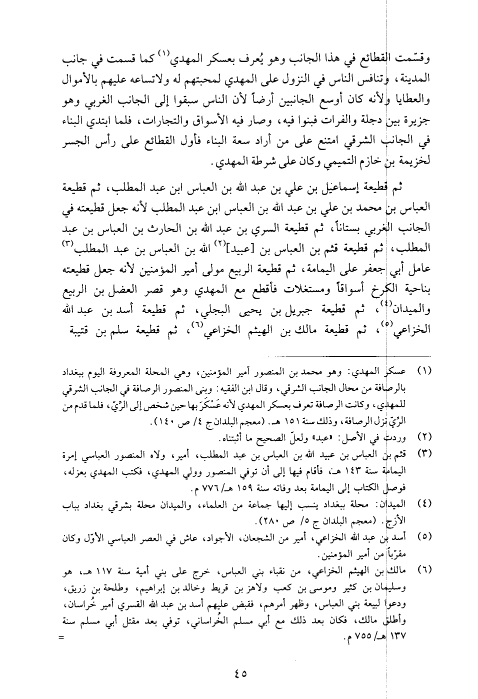 وقسّمت القطائع في هذا الجانب وهو يعرف بعسكر المهدي «1» كما قسمت في جانب المدينة، وتنافس الناس في النزول على المهدي لمحبتهم له ولاتساعه عليهم بالأموال والعطايا ولأنه كان أوسع الجانبين أرضا لأن الناس سبقوا إلى الجانب الغربي وهو جزيرة بين دجلة والفرات فبنوا فيه، وصار فيه الأسواق والتجارات، فلما ابتدي البناء في الجانب الشرقي امتنع على من أراد سعة البناء فأول القطائع على رأس الجسر لخزيمة بن خازم التميمي وكان على شرطة المهدي.