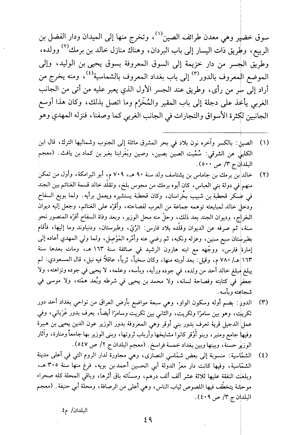 سوق خضير وهي معدن طرائف الصين «1» ، وتخرج منها إلى الميدان ودار الفضل بن الربيع، وطريق ذات اليسار إلى باب البردان، وهناك منازل خالد بن برمك «2» وولده، وطريق الجسر من دار خزيمة إلى السوق المعروفة بسوق يحيى بن الوليد، وإلى الموضع المعروف بالدور «3» إلى باب بغداد المعروف بالشماسية «4» ، ومنه يخرج من أراد إلى سر من رأى، وطريق عند الجسر الأول الذي يعبر عليه من أتى من الجانب الغربي يأخذ على دجلة إلى باب المقير والمخرّم وما اتصل بذلك، وكان هذا أوسع الجانبين لكثرة الأسواق والتجارات في الجانب الغربي كما وصفنا، فنزله المهدي وهو