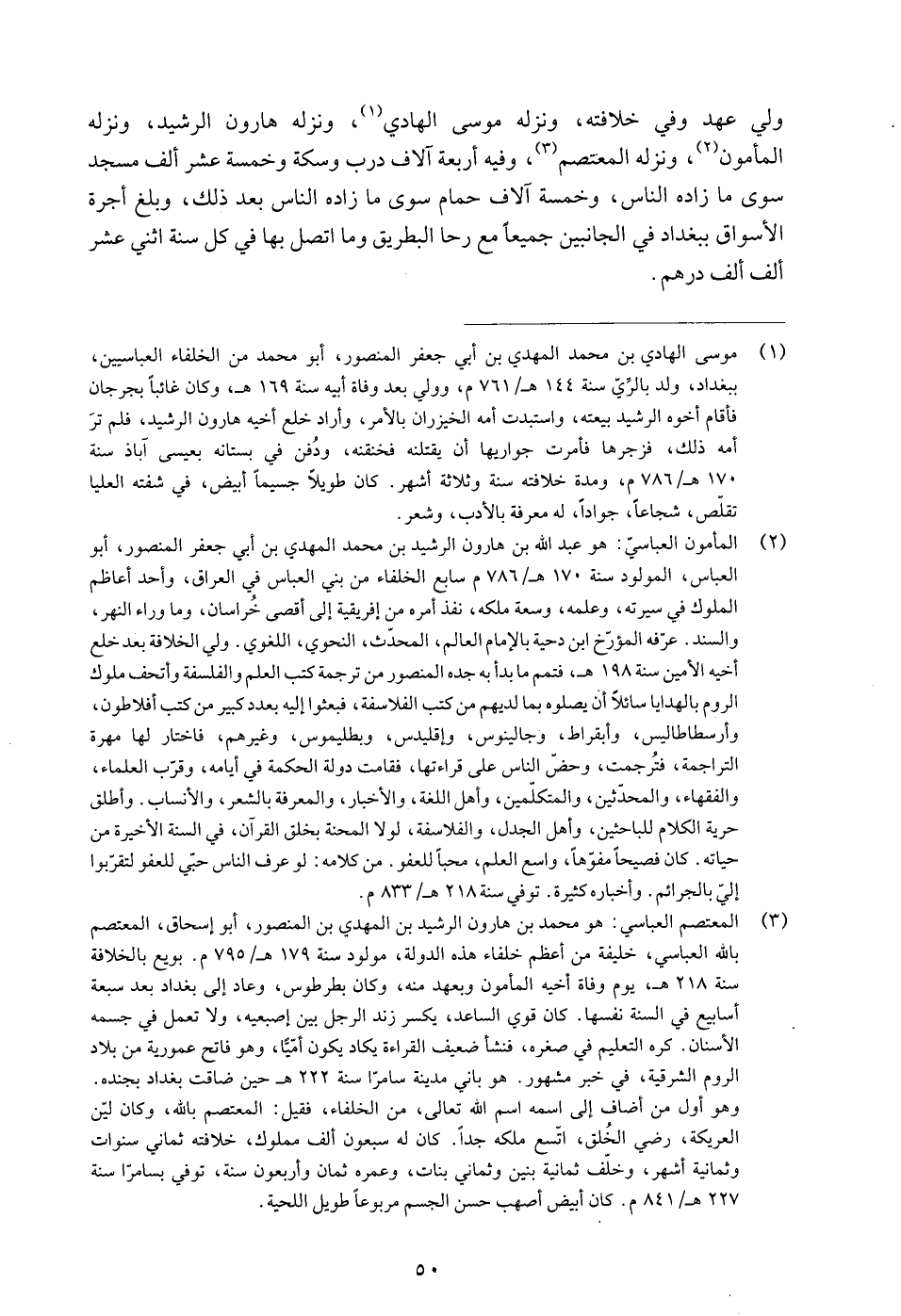 ولي عهد وفي خلافته، ونزله موسى الهادي «1» ، ونزله هارون الرشيد، ونزله المأمون «2» ، ونزله المعتصم «3» ، وفيه أربعة آلاف درب وسكة وخمسة عشر ألف مسجد سوى ما زاده الناس، وخمسة آلاف حمام سوى ما زاده الناس بعد ذلك، وبلغ أجرة الأسواق ببغداد في الجانبين جميعا مع رحا البطريق وما اتصل بها في كل سنة اثني عشر ألف ألف درهم.