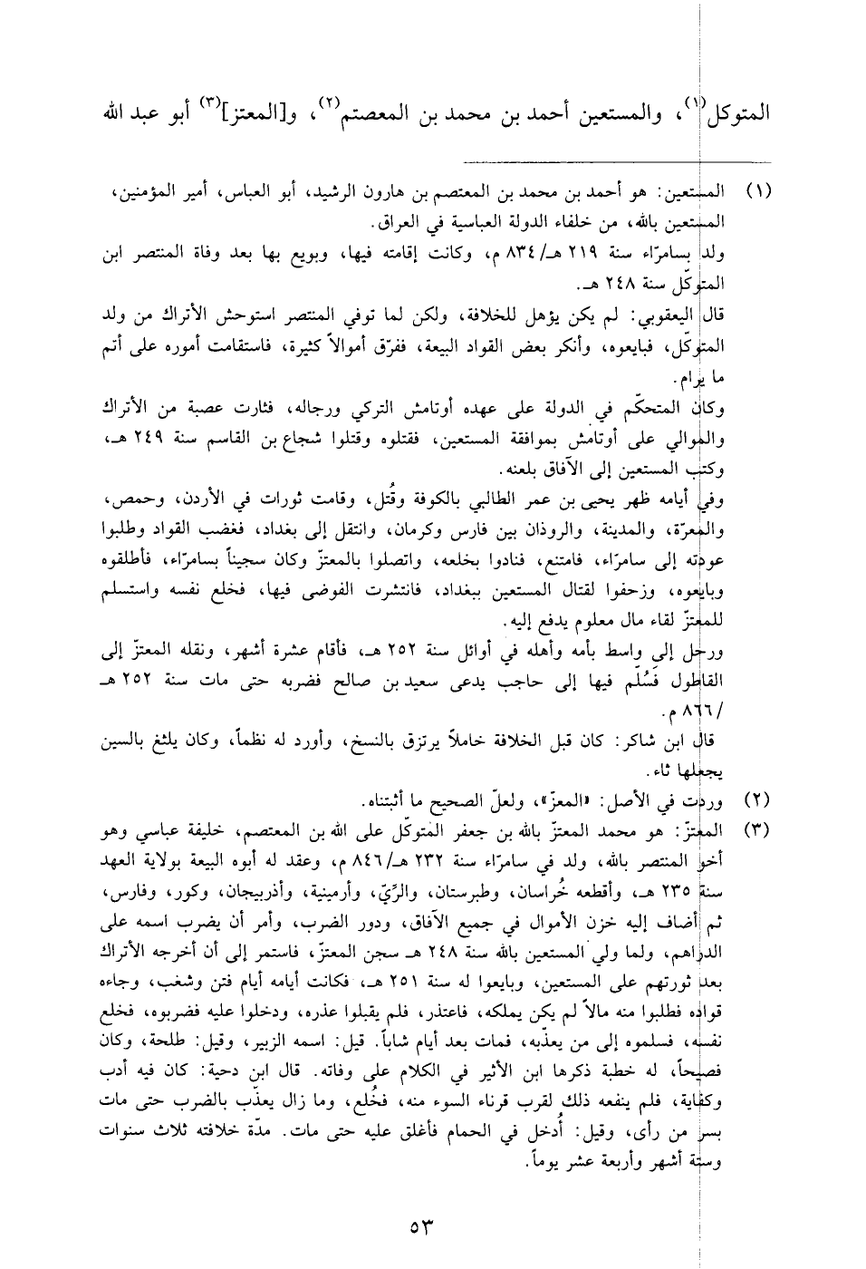 المتوكل «1» ، والمستعين أحمد بن محمد بن المعصتم «2» ، و [المعتز] «3» أبو عبد الله