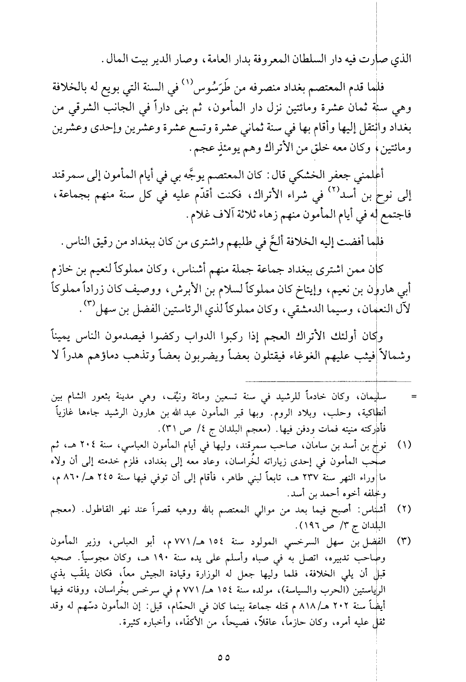 أعلمني جعفر الخشكي قال: كان المعتصم يوجّه بي في أيام المأمون إلى سمرقند إلى نوح بن أسد «2» في شراء الأتراك، فكنت أقدّم عليه في كل سنة منهم بجماعة، فاجتمع له في أيام المأمون منهم زهاء ثلاثة آلاف غلام.