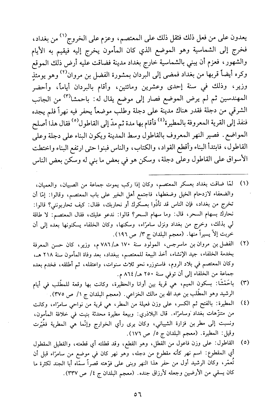 يعدون على من فعل ذلك فثقل ذلك على المعتصم، وعزم على الخروج «1» من بغداد، فخرج إلى الشماسية وهو الموضع الذي كان المأمون يخرج إليه فيقيم به الأيام والشهور، فعزم أن يبني بالشماسية خارج بغداد مدينة فضاقت عليه أرض ذلك الموقع وكره أيضا قربها من بغداد فمضى إلى البردان بمشورة الفضل بن مروان «2» وهو يومئذ وزير، وذلك في سنة إحدى وعشرين ومائتين، وأقام بالبردان أياما، وأحضر المهندسين ثم لم يرض الموضع فصار إلى موضع يقال له: باحمشا «3» من الجانب الشرقي من دجلة فقدر هناك مدينة على دجلة وطلب موضعا يحفر فيه نهرا فلم يجده المهندسين ثم لم يرض الموضع فصار إلى موضع يقال له: باحمشا «4» من الجانب الشرقي من دجلة فقدر هناك مدينة على دجلة وطلب موضعا يحفر فيه نهر فلم يجده فنفذ إلى القرية المعروفة بالمطيرة «5» فأقام بها مدة ثم مدّ إلى القاطول «6» فقال هذا أصلح المواضع. فصير النهر المعروف بالقاطول وسط المدينة ويكون البناء على دجلة وعلى القاطول، فابتدأ البناء وأقطع القواد، والكتاب، والناس فبنوا حتى ارتفع البناء واختطت الأسواق على القاطول وعلى دجلة، وسكن هو في بعض ما بني له وسكن بعض الناس