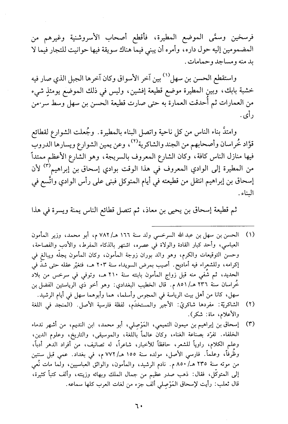 واستقطع الحسن بن سهل «1» بين آخر الأسواق وكان آخرها الجبل الذي صار فيه خشبة بابك، وبين المطيرة موضع قطيعة أفشين، وليس في ذلك الموضع يومئذ شيء من العمارات ثم أحدقت العمارة به حتى صارت قطيعة الحسن بن سهل وسط سر من رأى.