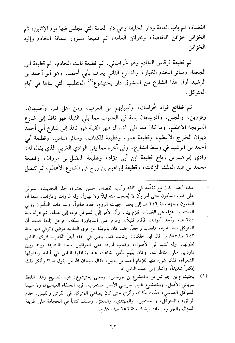 ثم قطيعة قرقاس الخادم وهو خراساني، ثم قطيعة ثابت الخادم، ثم قطيعة أبي الجعفاء وسائر الخدم الكبار، والشارع الثاني يعرف بأبي أحمد، وهو أبو أحمد بن الرشيد أول هذا الشارع من المشرق دار بختيشوع «1» المتطبب التي بناها في أيام المتوكل.