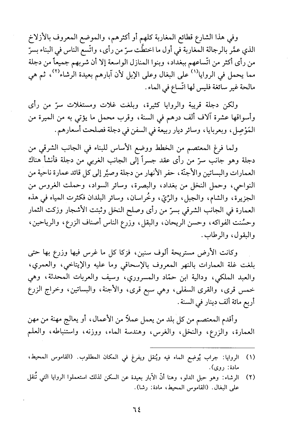 وأقدم المعتصم من كل بلد من يعمل عملا من الأعمال، أو يعالج مهنة من مهن العمارة، والزرع، والنخل، والغرس، وهندسة الماء، ووزنه، واستنباطه، والعلم