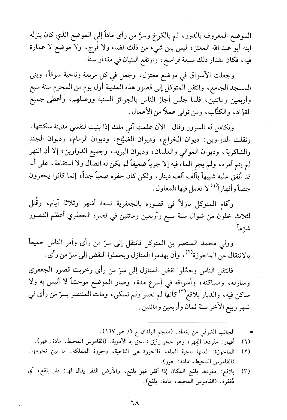 وولي محمد المنتصر بن المتوكل فانتقل إلى سرّ من رأى وأمر الناس جميعا بالانتقال عن الماحوزة «2» ، وأن يهدموا المنازل ويحملوا النقض إلى سرّ من رأى.