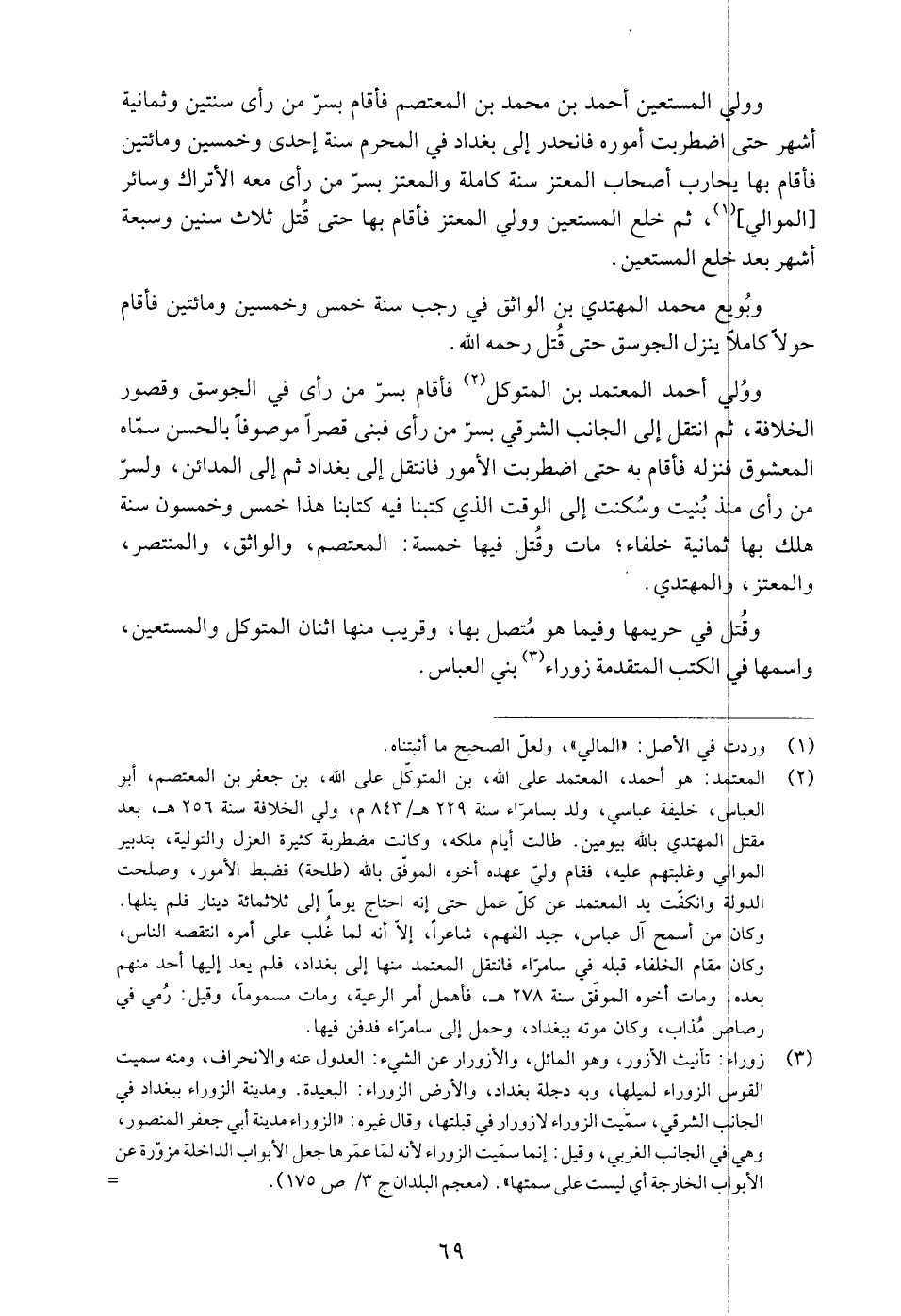 وقتل في حريمها وفيما هو متصل بها، وقريب منها اثنان المتوكل والمستعين، واسمها في الكتب المتقدمة زوراء «3» بني العباس.