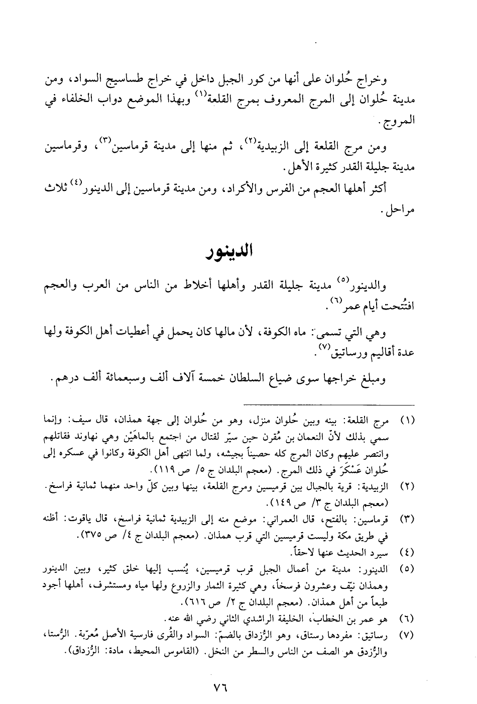 والدينور «5» مدينة جليلة القدر وأهلها أخلاط من الناس من العرب والعجم افتتحت أيام عمر «6» .