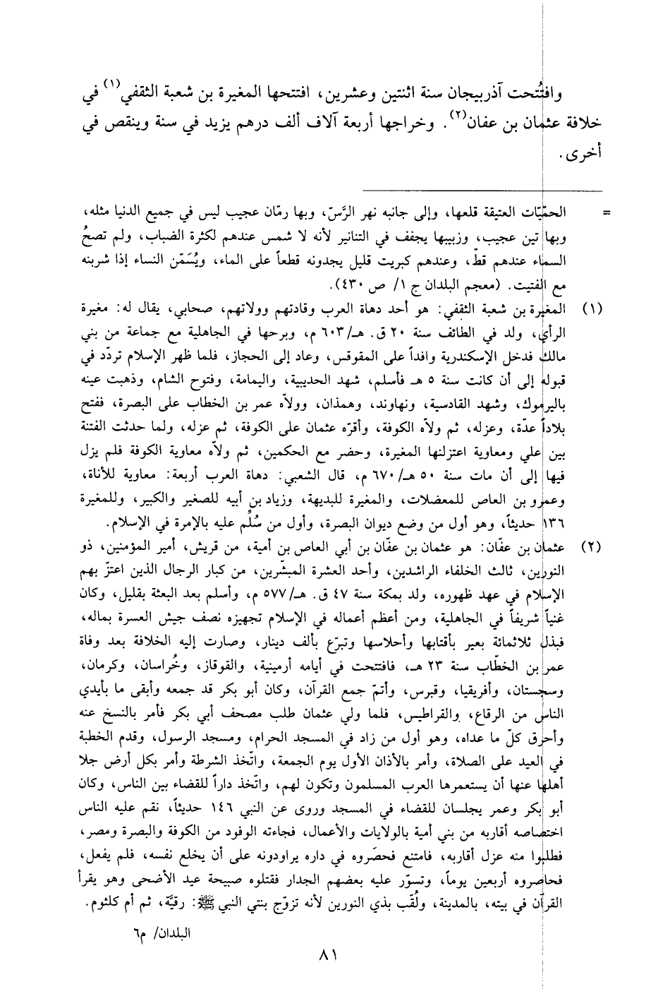 وافتتحت آذربيجان سنة اثنتين وعشرين، افتتحها المغيرة بن شعبة الثقفي «1» في خلافة عثمان بن عفان «2» . وخراجها أربعة آلاف ألف درهم يزيد في سنة وينقص في أخرى.