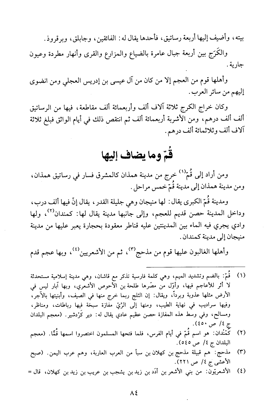 ومدينة قمّ الكبرى يقال: لها منيجان وهي جليلة القدر، يقال إنّ فيها ألف درب، وداخل المدينة حصن قديم للعجم، وإلى جانبها مدينة يقال لها: كمندان «2» ، ولها وادي يجري فيه الماء بين المدينتين عليه قناطر معقودة بحجارة يعبر عليها من مدينة منيجان إلى مدينة كمندان.
