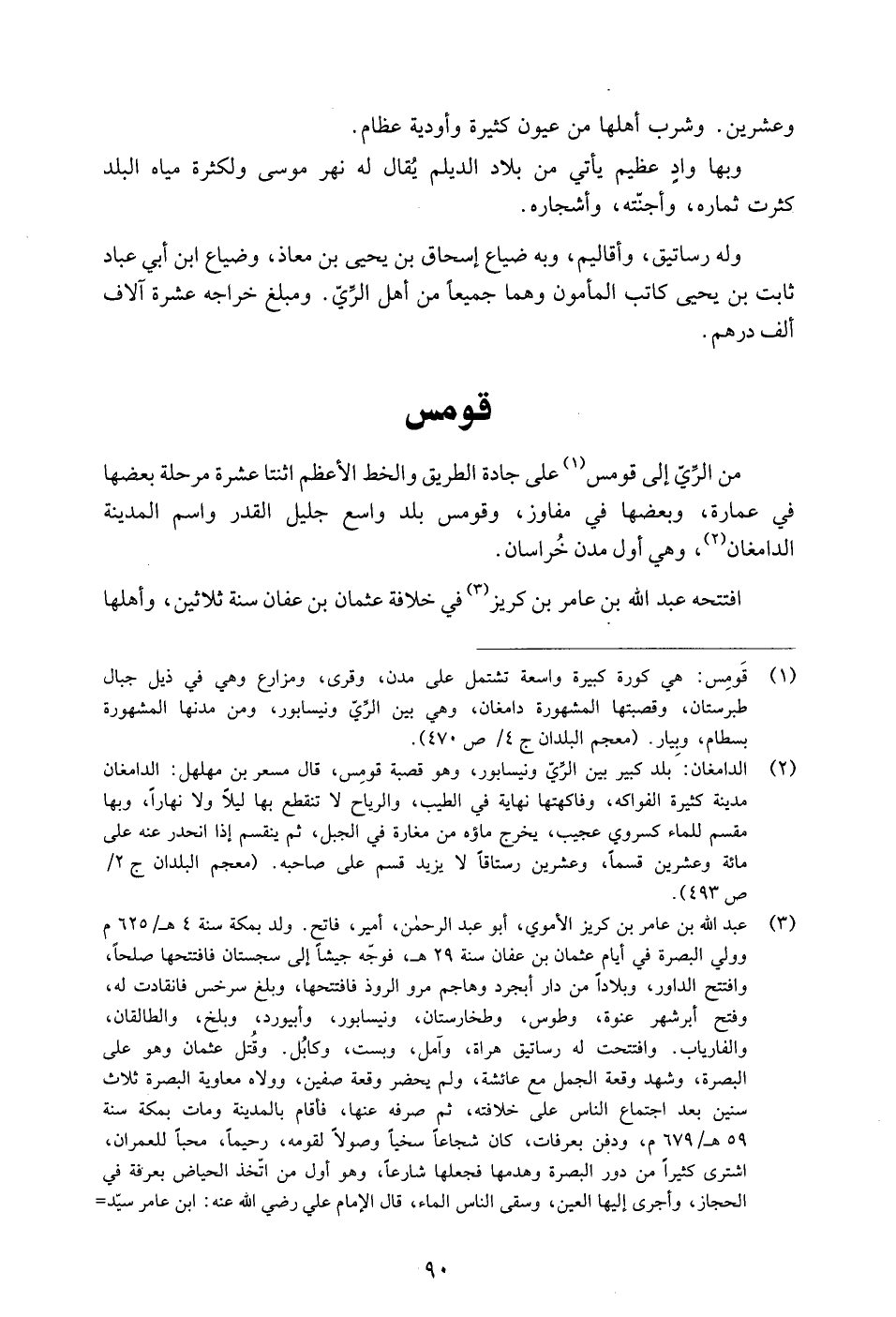 من الرّيّ إلى قومس «1» على جادة الطريق والخط الأعظم اثنتا عشرة مرحلة بعضها في عمارة، وبعضها في مفاوز، وقومس بلد واسع جليل القدر واسم المدينة الدامغان «2» ، وهي أول مدن خراسان.
