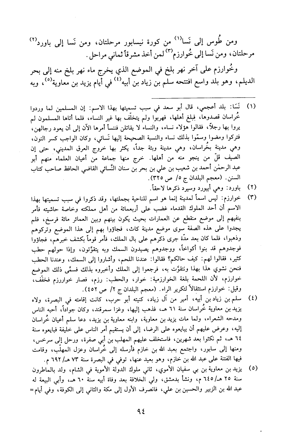 ومن طوس إلى نسا «1» من كورة نيسابور مرحلتان، ومن نسا إلى باورد «2» مرحلتان، ومن نسا إلى خوارزم «3» لمن أخذ مشرقا ثماني مراحل.