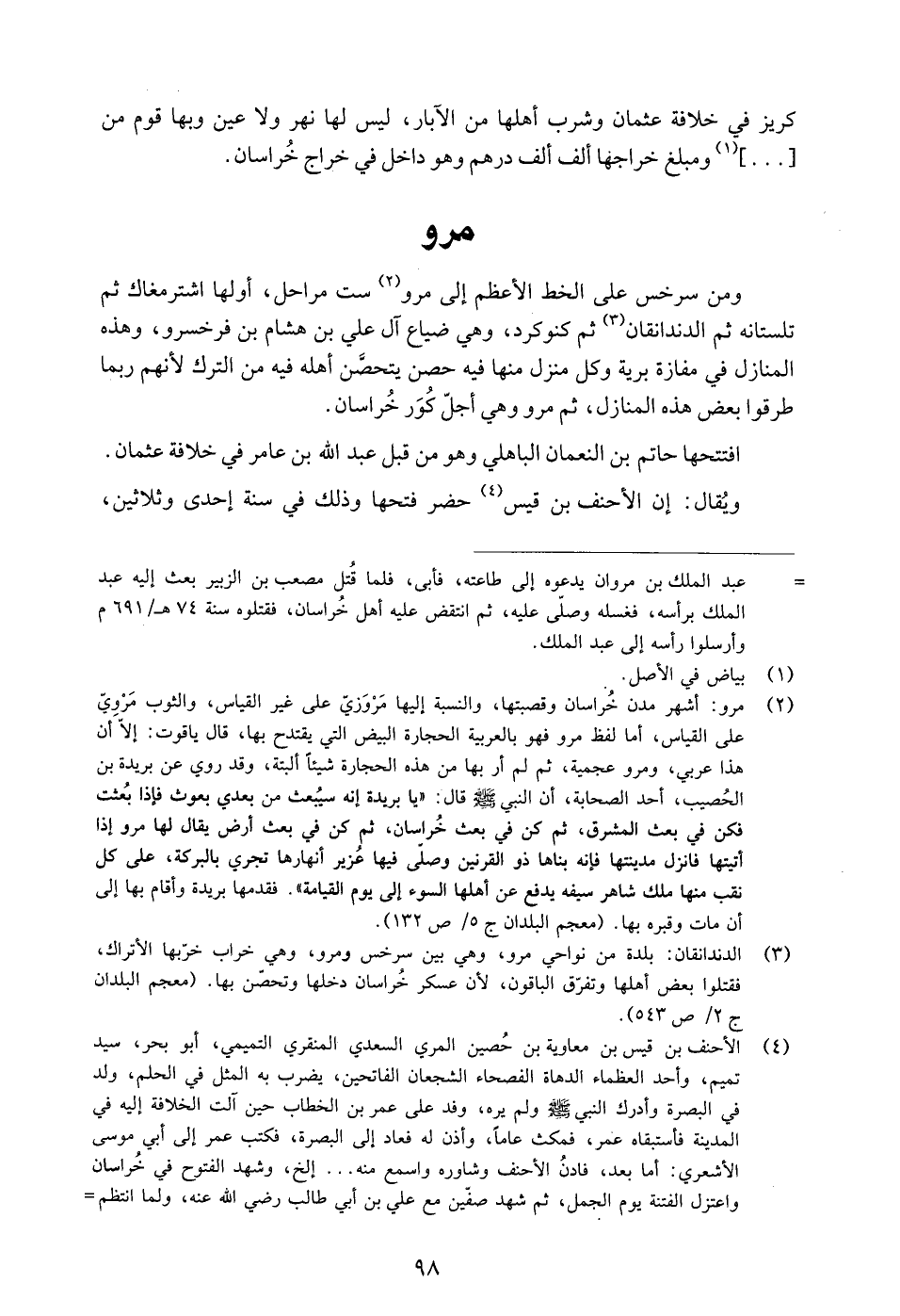 ومن سرخس على الخط الأعظم إلى مرو «2» ست مراحل، أولها اشتر مغاك ثم تلستانه ثم الدندانقان «3» ثم كنوكرد، وهي ضياع آل علي بن هشام بن فرخسرو، وهذه المنازل في مفازة برية وكل منزل منها فيه حصن يتحصّن أهله فيه من الترك لأنهم ربما طرقوا بعض هذه المنازل، ثم مرو وهي أجلّ كور خراسان.