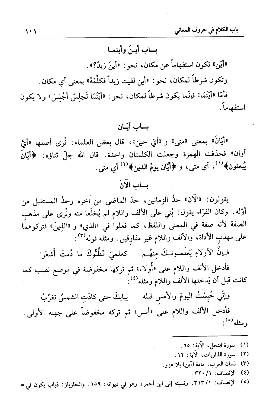 يقولون: "الآن" حدُّ الزمانين، حدّ الماضي من آخره وحدُّ المستقبل من أوّله. وَكَانَ الفرّاء يقول: بُني عَلَى الألف واللام لَمْ يُخلَعا منه وتُرى عَلَى مذهبِ الصِّفة لأنه صفة فِي المعنى واللفظ، كما فعلوا فِي "الَّذِي" و"الَّذِينَ" فتركوهما عَلَى مذهبِ الأداة، والألف واللام غير مفارِقين. ومثله قوله3: